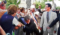 <p>The unusually aggressive incident occurred as the president shook hands with a crowd in the town of Brax in southwest France.<br /><br />The man was not armed, according to the national police service. An official with the service said the 32-year-old Frenchman lives in the Lot-et-Garonne region and works in the theatre business. <br /><br />The man was detained and being questioned in the nearby town of Agen. Images broadcast on French television showed Sarkozy reaching over a metal barricade to greet onlookers when an arm grabs his suit roughly by the shoulder and pulls it towards the crowd. Sarkozy started to lose his balance and fall, then immediately recoiled and righted himself. Security officers pulled the assailant to the ground.<br /><br />Sarkozy is an outspoken and divisive figure whose poll ratings have been quite low for months. He is expected to run for re-election next year. He occasionally gets heckled by critics, though only verbally.<br /><br />In one 2008 incident, a man was caught on video telling Sarkozy not to touch him as the president walked through a crowd. The man accused Sarkozy of “dirtying me,” and Sarkozy snapped back with an insult that mildly translated as “get out of here, you total jerk.”<br /></p>