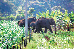 <p>Four jumbos, including two male, one female and a calf, were camping in the maize farm of Mariyappa. The farmers had a tough time trying to chase the elephants away. <br />With people assembling around the farm to have a glimpse of the elephants, chasing them away became all the more difficult.<br /><br />Tahsildar N C Jagadish and the police team led by Sub Inspector Nataraju had a harrowing time dispersing the crowd. Though the forest officials managed to chase away the pachyderms from the farm at Naganahalli by 11 am, after repeated efforts by bursting crackers, they entered the sugarcane field of Sannegowda at Sheeranahundi, through Machanayakanahalli.<br /><br />At this stage, one of the elephants flung Chandregowda (40), who was in the field, to the ground with its tusk. He was seriously injured and has been admitted to the K R Hospital in Mysore, after first aid at the H D Kote government hospital.<br /><br />Assistant Conservator of Forests Thammaiah, Range Forest Officers Praveen Kumar, Santosh Nayak, their staff and the police were making efforts till the evening to chase the jumbos away to the forest.</p>