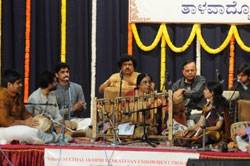<p>The Institute of Ethno Music recently organised a concert as a part of the ‘Tala Vadyotsava 2011 Music Conference’, that showcased an ensemble of global percussion instruments at the Bangalore Gayana Samaja. The event was held in honour of R K Srikantan, the chairman of the board of management and selection committee of the Percussive Arts Centre. </p>.<p><br />Srikantan plays and instructs on the art of Carnatic music, and has several disciples while his performance is a treat for the ears. The orchestra comprised Anasuya Kulkarni and her team of talented musicians. Conscious of the need to preserve the ancient musical traditions that Karnataka is famous for, Srikantan addressed the crowd on the importance of the pure heritage of Carnatic music, which he feels has been corrupted by a younger generation of musicians. The instruments that were showcased included traditional ones like the tabla, the mridangam, the flute and the violin, and a series of percussive instruments from countries around the world. <br /><br />Anasuya Kulkarni began the ceremony by enlightening the audience on the origins and rhythm of each instrument that was being played by the orchestra. Many of these were made of bamboo and heavy woods commonly found in Africa, and so produced a deep, guttural sound that served as a background beat for indigenous tribal music. <br /><br />However, Anasuya and her team had tweaked some of these instruments to better suit Indian sensibilities and showcased these forms of music as the central theme of the performance instead. She also demonstrated how the orchestra used verbal sounds to denote the rhythm of each instrument. <br /><br />The global percussive instruments that were showcased in the performance included a Mexican fish drum, a slip drum, a double-headed Dono drum and cylindrical drums from Ethiopia and Senegal. In addition to this, there was a Ugandan seed box rattle, a Burmese wooden clapper and an instrument from China that composed of a padded stick beat against a rectangular piece of wood. A small, metallic instrument from Vietnam, which is played with the mouth and fingers, was also used. These instruments produced a variety of deep and guttural as well as light and high-pitched sounds, which the orchestra integrated to create pure forms of Carnatic music.<br /><br />After enlightening the audience on the cross rhythms, multi-rhythms and tone of each instrument, Anasuya Kulkarni proceeded to play a few pieces, including the popular Vathapi Ganapathim Bhaje. <br /><br />The diverse compositions were both slow and devotional as well as fast-paced. Some of the members of the orchestra also performed independently to better showcase the music of their individual instruments. The audience, who recognised many of the compositions and loved the show, participated by clapping their hands to the rhythm of the music. </p>