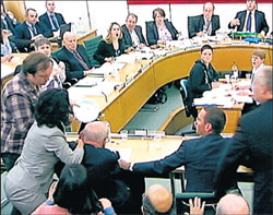 <p>Rupert Murdoch was attacked by a protester on Tuesday while giving evidence to a British parliamentary committee at which he defended his son and his company over a scandal that has rocked the British establishment.<br /><br />After two and half hours of evidence from the 80-year-old magnate and his 38-year-old son James, a man appeared to rise from the public area of the committee room and tried to hit the elder Murdoch with a “custard pie” — a dish of white foam. <br /><br />As James rose and police moved in, watched live by millions on television, Rupert Murdoch’s 42-year-old wife Wendi Deng, who had been sitting right behind her husband, leaped forward to slap the man. He was hauled away and the session suspended.<br />Ten minutes later, the session resumed with an apology from the chairman and a comment from one lawmaker that the Murdochs had shown “immense guts” to continue taking questions. Rupert Murdoch had removed his jacket.<br /><br />At the start of proceedings, the elder Murdoch had rejected personal responsibility for the phone-hacking and corruption scandal but, with his son, said the company was deeply sorry and intended to resolve the issue as quickly as possible. Sitting next to James, who opened the much-awaited proceedings in a packed committee room at Westminster by apologising to victims of voicemail hacking, the Australian-born chief executive of News Corp interjected: “I would just like to say one sentence,” he said. <br /><br />“This is the most humble day of my life.” He later said he was “shocked, appalled and ashamed” when he read two weeks ago of the case that has transformed the smoldering scandal into a “firestorm”, in the words of Prime Minister David Cameron. It has shaken Britons’ trust in the press, police and politicians, including Cameron himself.<br /><br />Murdoch has shut down his top-selling Sunday newspaper, the 168-year-old tabloid News of the World, and dropped a strategically important buyout bid for broadcaster BSkyB.<br /><br />During questioning, Murdoch insisted that he had been misled when previously denying that phone hacking at the News of the World went beyond the case of a reporter who was jailed for the offence in 2007. <br /><br />Occasionally slapping the table in apparent frustration, he said the paper was only a small part of his business, suggesting he could not supervise it personally. <br /><br /></p>