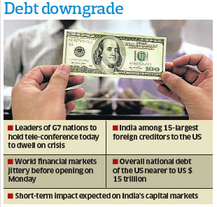 <p>Leaders of the powerful G7 nations on Sunday raced for a joint response to spiralling tension ahead of the opening of global financial markets on Monday with fears of further meltdown looming large in view of the downgrade and the eurozone crisis.<br /><br />The market meltdown last week had seen more than US $ 2.5 trillion being wiped off from investors' wealth, and the policy- makers were seen debating over ways to avoid further turmoil.<br /><br />An emergency phone meeting of finance ministers and central bank governors of the seven leading economies in the world has been convened on Monday, Kyodo news agency reported on Sunday to discuss the twin crisis.<br /><br />Amid the reigning chaos, the rating agency, Standard & Poor’s, which has downgraded the US from the top-notch ‘AAA’ level, gave another dire warning that there was 1 in 3 chance that the US credit rating could be downgraded another notch if conditions erode over the next six to 24 months.<br /><br />Giving a bleak future of America’s credit rating, a top official of S&P said, “We have a negative outlook,...which... leads to a longer time frame, from 6 months to 24 months.”<br />India’s concerns.<br /><br />Back home, concerns grew as it emerged that India is one of the 15-largest foreign creditors to the US, as the country’s exposure to the United States’ ballooning debts is estimated at $41 billion — higher than the money America owes to countries like France and Australia.<br /><br />The overall national debt of the US is moving nearer to $15 trillion, out of which it owes over $4.5 trillion to foreign countries holding the US government debt securities. <br /><br />While China is the single-largest holder of the US treasury securities with $1.15 trillion, India stands at 14th position with $41 billion (about Rs 1.83 lakh crore), as per the US Treasury Department.<br /><br />The unprecedented debt downgrade of the US might also lead to an immediate action by the Reserve Bank of India, which allows holding of government debt securities of countries with mostly a “Triple-A” rating. While a vast majority of the $41 billion portfolio is owned by the RBI itself, some Indian banks also might have some exposure, sources said.<br /><br />They said the RBI was most likely to allow holding of the US securities even with a notch-lower rating, as it has been itself amassing the US treasury securities over the past one year despite a deepening debt crisis there.<br /><br />The Indian holding has grown by about $10 billion in the past one year, the US Treasury data shows. The RBI holds the US treasury securities as part of its foreign exchange reserves and the dollar holdings account for about 10 per cent of its total portfolio. <br /><br />Some experts pointed out that India has been increasing its exposure on the pretext that the US debt bonds were one of the most secure from default risks. While an exposure of $41 billion is a substantial figure from Indian context, this accounts for less than 0.3 per cent of the US’ total debt and just about 1 per cent of its total foreign debts. In fact, the Indian exposure is equivalent to an estimated $40 billion worth treasury bonds held by one single entity, Warren Buffett-led Berkshire Hathaway.<br /><br />The overall foreign holding of the US government securities has grown by about $500 billion in the past one year, while China has increased its exposure by about $300 billion during this period.<br /><br />Among top foreign creditors, China is followed by Japan ($912 billion), the UK ($346 billion), Brazil ($211 billion), Taiwan ($153 billion), Hong Kong ($122 billion), Russia ($115 billion), Switzerland ($108 billion), Canada ($91 billion), Luxembourg ($68 billion), Germany ($61 billion), Thailand ($60 billion), Singapore ($57 billion) and India ($51 billion).<br /><br />Countries with lower exposure than India include Turkey, Ireland, South Korea, Belgium, Poland, Mexico, Italy, Netherlands, France, Philippines, Norway, Sweden, Colombia, Israel, Chile, Egypt, Malaysia and Australia. <br /><br /></p>