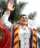 <p>These days one often gets to hear and see the innovative ways in which a movie is promoted and packaged to attract the audience. The promoters of Raaj, The Showman, one of the most awaited movies of Sandalwood have also been inspired. Just a few days before its worldwide release, the crew has erected a 45-ft high mould of Dr Rajkumar in front of Santosh Theatre, which took almost three months to construct. <br /><br />“We had initially called the movie Polli but then we decided to change the name and the first thing that came to my mind was Dr Rajkumar and that’s how Raaj, The Showman came into being,” says Hattrick Director Prem, while adding, “this is the first time anyone has attempted such a thing and it is our way of felicitating him. The mould will be there till the movie runs in the theatre. After which the mould will be shifted to the Rajkumar samadhi.”<br /><br />“Since the movie is scheduled to release in 120 theatres all over the world, it will be difficult to have such a figure at all the theatres. Our main theatre in Mysore too wanted such a mould to be made for them but we don’t have enough time for that. <br />However we will be putting up huge cut-outs for sure.”<br /></p>