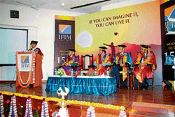 <p>The 15th Annual Convocation of IFIM Business School was organised in their college campus at Electronic City recently. <br /><br />The convocation was declared open by the Chairman, CDE and Chief Editor of ‘Dalal Street Investment Journal’ V B Padode. <br /><br />This was followed by the welcome address by B P Pethiya, Director, IFIM Business School. <br />Sanjay Padode, Secretary, CDE, was invited to join hands in lighting the convocation lamp. <br /><br />Chief guest V N Rajasekharan Pillai, Vice Chancellor of IGNOU, New Delhi; Bhaskar Bhat, MD, Titan Industries Ltd and Sudhir Kant, President, Krishna Antioxidants Pvt Ltd were among the guests. <br /><br />As many as 205 students of the PGDM programme of 2009-11 received their diplomas at the ceremony. <br /><br />Rajasekaran Pillai inaugurated the state-of-the-art computer centre at IFIM Business School and emphasised that well-augmented learning facilities will go along in transforming IFIM Business School into a paperless and green education centre. <br /><br />Pethiya, in his welcome address, said that convocation is the culmination of the <br />relentless efforts of the students, faculty, management, stakeholders and parents. <br /><br />He formally announced a new scholarship of Rs one lakh for girl student funded by V B Padode Foundation. <br /><br /> He also conferred for the first time ‘The Distinguished Alumni Award’ to Debtosh Chatterjee and Gunit Singh from the first batch (1995-97) of IFIM. <br /><br />Bhaskar Bhat asked students to learn from the past and embrace change. Sharing his thoughts on the importance of values, he said that it was easy to distinguish between right and wrong but the important part was to separate greed from need. <br /><br />Congratulating each student, Sudhir Kant advised the graduates to be ready for the challenges of knowledge management and focus on the need to bring out the uniqueness in each. <br /><br />He said success will come to those who can identify the right solution at the right time. <br /><br />Student Bidish Chatterjee was awarded the ‘Chairman’s Gold Medal’ for the best all-rounder. <br /><br />‘RAK Ceramic Award for Academic Excellence’, awarded to the topper amongst girl students, was given to Priyadarshini S. The ‘Chairman’s Gold Medal’ for topper in each stream were conferred to Mahesh Kumar S for PGDM General, Vidhushi Saxena <br />for PGDM Finance and Suhana K R for PGDM IB. <br /><br />For the first time, functional toppers were also awarded. Varun Bhatnagar was <br />awarded the ‘Chairman’s Gold Medal’ for Marketing; Atmakuri Ram Mohan for <br />Finance and Amrita anguly for International Business. <br /><br />The Chairman’s Gold Medal for Best Industry Internship Programme (IIP) was awarded to Amit Shankar C. </p>