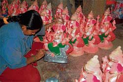 <p>There has been no vigil against the sale and manufacture of traditional clay idols painted with harmful paints.<br /><br />Ganesha idols are manufactured at two centres in the town - one on Kataripalya road; and another at Tambihalli on the outskirts where plaster of paris idols are made. <br /><br />Public who throng both the places are not sparing any thought to purchase an eco-friendly model.<br /><br />Attraction-centred<br /><br />“All we want is an attractive idol with eye-catching colours,” said many purchasers. Some were even unaware of the idols made of plaster of paris. <br /><br />They were worried about offering puja to the idol without any colour. Lack of awareness was apparent.<br /><br />Viji Karthikeyan, an officer at the local office of Karnataka Pollution Control Board said that a meeting was held on July 13 on celebration of an eco-friendly Ganesha festival. <br /><br />The idol manufactures had been asked to purchase lead-free paint produced by Mysore Paints and Varnish Limited. He said that the town and city municipal councils in the district had been told to create public awareness on the need to observe the festival in an environment-friendly manner.<br /><br />Story of the other side<br /><br />However, manufacturers have a different version. They seek uniform norms across the State. <br /><br />“The rules on eco-friendly idols should be enforced all across the State. There would be no tangible benefit if the norms are brought into effect at some places only,” said Somashekhar, who makes idols on Kataripalya road. <br /><br />The idols made by him are sold in Kolar, Chikkaballapur, Mysore, Mandya and Bangalore Rural districts.<br /><br />The idols without colour are are not in demand. He sells around 100 such idols during an year. Majority of the public prefer attractive idols over eco-friendly ones, he said.<br /><br />One more meeting will be held on August 25 to discuss modalities for common immersion facilities. However, by that time, the sale of coloured idols would be a brisk pace. Neither any public awareness could be created at that point of time. <br /><br />The district administration and the Pollution Control Board should jointly work out a strategy on promoting eco-friendly idols.</p>