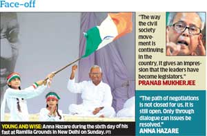 <p>Later, in a hardening of his stance on the sixth day of his fast, anti-corruption crusader Anna Hazare read the riot act to the Congress-led UPA government saying, “Bring the Jan Lokpal bill or go.”<br /><br />With huge crowds thronging the Ramlila Maidan and India Gate in Delhi as well as elsewhere across the country, signaling a surge in public support for the Team Anna’s demand for a strong Lokpal Bill, the veteran Gandhian on Sunday upped the ante and called for ‘changes’ in the country.<br /><br />Even as speculation was rife about back-channel talks between the government and Team Anna to end the impasse over the 74-year-old’s fast, Hazare in the evening called upon his supporters to prepare for wider struggle. His close aides later said that the government had informally sent to them a compromise formula, but they rejected it as it contained nothing new.<br /><br />“We have received a proposal from the government which is nothing but the government's Lokpal Bill. None of our demands have been included. There is no agreement between civil society and government,” said Arvind Kejriwal, a close associate of the Gandhian.<br /><br />Earlier, a top Maharashtra bureaucrat Additional Chief Secretary Umesh Chandra Sarangi, who knows Hazare well, met him twice on Sunday. Another intermediary was said to be Indore-based spiritual leader Baiyujji Maharaj, who met Hazare and Union Minister Kapil Sibal. A proposal, of which no details were made public, was conveyed to Hazare which his group has rejected.<br /><br />A frail-looking Hazare later addressed a huge crowd that had marched from India Gate to Ramlila Maidan and declared, “If the government does not get the Lokpal Bill passed by August 30, there would be an unprecedented revolution in the country by the people....The government will have to either get the Bill passed (in Parliament) or go,” said Hazare.<br /><br />He made the remark a day after Prime Minister Manmohan Singh said that the government was open to dialogue on Lokpal Bill and there was a lot of scope for give and take.<br /><br />Both Hazare and Kejriwal asked their supporters to hold dharnas in front of houses of MPs in their constituencies and demand written commitments in support of Jan Lokpal Bill. “The dharna should also cover Ministers and leaders of various political parties,” they said.<br /><br />The government had fielded Sarangi, reportedly at the instance of Maharashtra chief minister Prithviraj Chavan, in an attempt to break ice with the civil society group. <br />Hazare’s close aides, however, said that Hazare’s meetings with Sarangi and Baiyujji Maharaj were personal and not intended to discuss any compromise formula. The core committee of Team Anna had a meeting on Sunday to chalk out the strategy for the future course of the agitation in view of the prime minister’s readiness for discussions. Former law minister Shanti Bhushan, eminent lawyer Prashant Bhushan, Right To Information activist Arvind Kejriwal and former Karnataka Lokayukta justice Santosh Hegde attended the meeting. According to sources, he suggested flexibility on the issues like inclusion of the prime minister and higher judiciary in the purview of the proposed institution of ombudsman that the much-debated Lokpal Bill intended to set up to inquire allegations of corruption by public functionaries. He, however, suggested that such flexibility could be adopted only if the government was ready to remove other infirmities in the Bill that was introduced in Lok Sabha and is now being studied by the Parliamentary Standing Committee.<br /><br />Though Kejriwal, who is known to be a hardliner, understood to have opposed any climb-down or dilution of the Jan Lokpal Bill, Team Anna apparently decided that it would insist on withdrawal of the Bill now before the Parliamentary Standing Committee before agreeing for talks with the government.<br /><br />Prashant Bhushan however maintained that prime minister should be brought under the ambit of the Lokpal. Bhushan also said the Team Anna was ready to talk to the Government, but would not compromise on its core issues. </p>