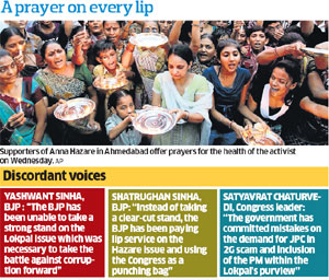 <p>While the meeting between associates of Gandhian Anna Hazare and Finance Minister Pranab Mukherjee-led government side failing to break ground on the vexatious issues, an all-party meeting held at Prime Minister Manmohan Singh’s 7, Race Course Road residence urged the civil rights activist, whose fast is hours away from entering the tenth day, to end the hunger strike.<br /><br />Representatives of the parties made it clear that some provisions of the Jan Lokpal bill were unacceptable as they violated the supremacy of Parliament. <br /><br />But the Centre also accepted that it was caught in a cleft stick with Singh admitting that the government was in a “bind” from which it had to come out and that “pratical and pragmatic” solutions to the Lokpal bill issue had to be found.<br /><br />After the meeting between Hazare’s associates and the government side ended around 10 pm, Law Minister Salman Khurshid said: “We are trying to understand each other’s perspectives...We will talk tomorrow as well...the priority is Anna’s health.” <br /><br />But Hazare’s associate and senior advocate Prashant Bhushan said: “We are back to square one.” Minutes after the talks ended in a stalemate, Hazare told his supporters close to midnight at the Ramlila grounds to hold “jail bharo” demonstrations and protests against MPs. He pleaded with them not to resort to violence.<br /><br />With the Gandhian declaring that his hunger strike was nowhere near ending soon, the Centre prepared plans to shift him to a hospital if the need arose. But in the course of the day, the countours of an acceptable compromise appeared to have emerged as the two sides tried to address the key sticking points. Earlier, in the Rajya Sabha, the government announced that Hazare’s Jan Lokpal bill had been forwarded to the parliamentary standing committee for consideration. “We have forwarded the Jan Lokpal bill to the standing committee for its consideration. It is for the committee to decide,” Minister of State for Personnel V Narayanasamy said in the Rajya Sabha.<br /><br />At an Iftar party hosted at his residence after the all-party meeting, the prime minister hoped that Hazare would heed the appeal by the political parties and added that Parliament would not accept a deadline to pass any legislation.<br /><br />“It is their (Team Anna’s) suggestion. It does not mean we accept everything,” Singh said while reacting to Hazare’s August 30 deadline for passage of the Jan Lokpal bill.<br />“I have always been in favour of inclusion of the prime minister in Lokpal. But my experienced colleagues say it will not be desirable,” he said. But he indicated that the government did not favour withdrawal of the Lokpal bill which has already been introduced in Parliament.<br /><br /><br />While at the all-party meeting the leaders of major Opposition parties, including the BJP and the Left parties, demanded that the government withdraw its Lokpal bill from Parliament and present a fresh one, the government held two rounds of talks with leaders of the Hazare team. Leaders like Lalu Prasad and Ramvilas Paswan supported the government’s Lokpal Bill.<br /><br />In the two rounds of discussions that Mukherjee, the chief negotiator for the government, and Khurshid had with Hazare’s associates, the differences further narrowed down between the government and the civil society. The Hazare team had held one round of talks with the government on Tuesday.<br /><br />Three members of Team Anna -- Arvind Kejriwal, Kiran Bedi and Prashant Bhushan -- held talks with Law Minister Salman Khurshid, who was accompanied by East Delhi MP Sandeep Dikshit.<br /><br />Informed sources said there were now only three points of differences between the two sides and they included the government employees at all levels coming under the ambit of Lokpal, a single Lokpal Act covering state Lokayuktas also and ‘citizens’ charter’ where in every government office it would be clearly mentioned the number of days required to clear a particular type of service.<br /><br />On Tuesday, the government agreed for the other contentious points: including the prime minister and the anti-corruption wing of the CBI in Lokpal. As regards the higher judiciary, the government said the Judicial Accountability and Standards Bill would address the relevant issue. The Hazare team agreed to this point. There was, however, no word on the inclusion of conduct of MPs inside Parliament in the bill.<br /><br /> </p>