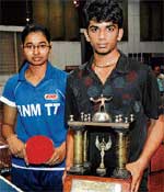 <p>Navaneeth, who had taken the Youth boys’ title the previous day, was simply too strong for Aditya Mahagoankar, winning a straightforward final in four straight games. As the match wore on, Mahagoankar began to put up more of a fight, but he couldn’t prevent Navaneeth from completing an 11-5, 11-7, 11-8, 11-9 victory.<br /><br />By contrast, Aishwarya R Bidri scripted a more difficult route to the women’s crown. Forced to dig deep after dropping the first game, the BNM player fought back to edge out compatriot Bhavana Harane 9-11, 11-4, 11-6, 11-8, 11-6.<br /><br />Results: Men’s singles, final: Navaneeth AR (HOR) bt Aditya Mahagoankar 11-5, 11-7, 11-8, 11-9. (Semifinals): Navaneeth bt Jaideep Das (SWR) 11-9, 11-2, 12-10, 7-11, 11-9; Aditya M bt Anirban Tarafdar (CB) 11-7, 11-7, 7-11, 4-11, 11-8, 11-7. <br /><br />Women’s singles, final: Aishwarya R Bidri (BNM) bt Bhavana Harane (BNM) 9-11, 11-4, 11-6, 11-8, 11-6. (Semifinals): Aishwarya bt Raksha R (JTTA) 7-11, 6-11, 11-8, 11-8, 11-9, 4-11, 11-4; Bhavana H bt Sushmitha Bidri (BNM) 11-3, 11-9, 11-4, 6-11, 11-8. <br /><br />Non-medallst singles, final: Suraj D (Mal) bt Chetan (OMTTI) 11-8, 15-13, 6-11, 12-10. (Semifinals): Suraj D bt Mithun (GSC) 11-4, 11-8, 11-6; Chetan bt Arpitha BS (JTTA) 11-8, 11-9, 2-11, 11-6.<br /><br />Non-medallist doubles, final: Y Dinesh Rao (GSC)/Dinakar Naidu (MAL) bt Aditya S Raj/Sudeep G 12-10, 11-5, 11-4. (Semifinals): Dinesh/Dinakar bt Rachit/Vaibhav Dahibhate 7-11, 10-12, 11-9, 11-5, 12-10; Aditya/Sudeep bt DRGopinath/Nagendra 23-11, 11-7, 7-11, 11-9.<br /><br />Team, final: South Western Railway bt Horizon ‘A’ 3-1. (Semifinals): South Western Railway bt Canara Union ‘A’ 3-0; Horizon ‘A’ bt BNM ‘A’ 3-1.</p>