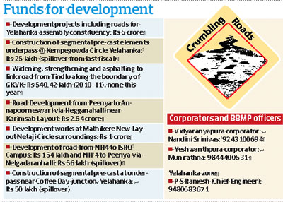 <p>The jurisdictional woes between the BBMP and other civic bodies has left citizens in a state of lurch. While the Palike lays the roads, it is dug up by the BWSSB and BESCOM leaving an impression on commuters that there never existed a road. The problem has been aggravated since monsoon. <br /><br />Vidayaranyapura Main Road is a prime example of such a case. It is a typical case of how post civic work, the officials forget to re-lay the road. The main road, which is one of the arterial routes connecting Yelena or M S Palya, was dug up earlier this year by BWSSB to lay a water pipeline. <br /><br />Although, the work was done in a phased manner to avoid inconvenience it has come to an abrupt halt nearly a month ago. <br /><br />Result: The entire stretch of over one kilometer has become a nightmare for commuters and pedestrians.<br /><br />While one end of the road is muddy and uneven since it was dug up, the other side has become a cess pool. The apathy shown by the civic agencies has lead to unnecessary traffic jams and vehicles from both sides have to wriggle through. Footpath have been left uneven and in certain places there is no space for the pedestrians to walk on the road. <br /><br />Subhash, owner of a textile shop, said that the condition of the road had been like this for the past eight months. “We use bylanes to reach the end of the road faster. What’s worse is dust gathers in the shop the entire day,” he said. <br /><br />The condition of the roads is no better on the Hessaraghatta Main Road in T Dasarahalli. Both sides of the roads are uneven and on some untarred stretches, gravel roads have become the regular feature for commuters use.<br /><br />Shopkeepers state that no work has progressed in the last three months. “The gravel have been put to widen the road but the work is very slow. Since there is movement of heavy vehicles, there is a lot of traffic at times,” said Shanmugam owner of condiment shop. The rains have made the matters worse with sides of the roads covered in slush,he adds. <br /><br />On the Peenya-Yeshwantpur stretch, the Metro work has lead to deterioration of the road. At many places, the top layer of the tarred road has worn out. <br /><br />Potholes, bottlenecks caused by Metro barricades at various points, the Yeshwantpur station outlet and flow of heavy inter-state vehicles has aggravated the traffic condition with commuters spending at least 45 minutes to cross the stretch. <br /><br />On the road leading from Mathikere Main Road to Yeshwantpur market, the situation is grave. <br /><br />Not only is one side of the road uneven after BWSSB having dug up for lying of pipelines, but the vehicles parked on the other side of the already narrow road makes it a taxing for the drivers to use the road. The footpaths having been encroached by hawkers and shops adds to the already crowded road with pedestrians.</p>