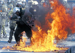 <p>Outside parliament, demonstrators hurled chunks of marble and gasoline bombs at riot police, who responded with tear gas and stun grenades. Police said at least 14 officers were hospitalised with injuries. At least three journalists covering the demonstrations sustained minor injuries.<br /><br />The violence spread across the city center, as at least 100,000 people marched through the Greek capital on the first day of a two-day general strike that unions described as the largest protest in years. Police and rioters held running battles through the narrow streets of central Athens, as thick black smoke billowed from burning trash and bus-stops.<br /><br />Wednesday’s strike, which grounded flights, disrupted public transport and shut down shops and schools, came before a parliamentary vote late on Thursday on new tax increases and spending cuts.<br /><br />International creditors have demanded the reforms before they give Greece its next infusion of cash. Greece says it will run out of money in a month without the €8 billion ($11 billion) bailout money from its partners that use the euro and the IMF. Most of the protesters who converged in central Athens marched peacefully, but crowds outside of parliament clashed with police who tried to disperse them with repeated rounds of tear gas. A gasoline bomb set fire to a presidential guard sentry post at the Tomb of the Unknown Soldier outside Parliament, while running clashes broke out in several side streets near the legislature and the capital's main Syntagma Square.<br /><br />Nearby, groups of hooded, masked protesters tore chunks of marble off building fronts with hammers and crowbars and smashed windows and bank signs. Scuffles also broke out among rioters and demonstrators trying to prevent youths from destroying storefronts and banks along the march route.<br /><br />In Thessaloniki, protesters smashed the facades of about 10 shops that defied the strike and remained open, as well as five banks and cash machines. Police fired tear gas and threw stun grenades. <br /><br />All sectors — from dentists, hospital doctors and lawyers to shop owners, tax office workers, pharmacists, teachers and dock workers — walked off the job before a parliamentary vote on Thursday on new austerity measures which include new taxes and the suspension of tens of thousands of civil servants. Flights were grounded in the morning but some resumed at noon after air traffic controllers scaled back their strike plan from 48 hours to 12. Dozens of domestic and international flights were still canceled. <br /><br />Ferries remained tied up in port, while public transport workers staged work stoppages but kept buses, trolleys and the Athens subway system running to help protesters.<br /><br />In Parliament, Finance Minister Evangelos Venizelos told lawmakers that Greeks had no choice but to accept the hardship. “We have to explain to all these indignant people who see their lives changing that what the country is experiencing is not the worst stage of the crisis,” he said. <br /><br />“We just can’t take it any more. There is desperation, anger and bitterness,” said Nikos Anastasopoulos, head of a workers’ union for an Athens municipality.<br />A communist party-backed union has vowed to encircle Parliament Thursday in an attempt to prevent deputies from entering the building for the vote.<br /></p>