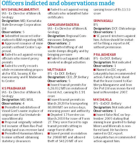 <p>The committee headed by Additional Chief Secretary K Jairaj in its 316-page report has attached two annexures to its interim report. <br /><br />Annexure A contains a list of seven officers belonging to All India Services. In view of specific charges in the Lokayukta report against the said officers, the Committee has opined that appropriate disciplinary action be initiated against the officers.<br /><br />With regard to former deputy conservator of forests, the committee recommends that strict disciplinary action is warranted, as he has caused pecuniary losses of Rs 1.91 crore and Rs 13.53 crore to the State government. “This is besides undue favour and abuse of office,” the committee states.<br /><br />In Annexure ‘B’, the committee has listed the names of two IAS officers S N Jayaram and Jawaid Akhtar, who had served as deputy commissioners of Bellary. <br /><br />The report states that after its discussions with the Revenue department, no explicit failure or negligence has been ascertained. “The action of the officers was in normal course of duty,” the report adds.</p>