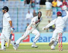 <p>Having topped 300 just once in their last seven Tests in the Caribbean and England combined, India’s batsmen were expected to rediscover scoring ways on surfaces on which they have learnt the ropes. <br /><br />At the Feroze Shah Kotla on an action-packed Monday, India refused to buck the trend, putting in another inept display to find themselves with their backs firmly against the wall in the first Test against the West Indies. Day two saw 17 wickets go down for 278 runs in 84.1 overs, though the pitch was far from diabolical, even if the ball continued to stay down more and more.<br /><br />Bowled out for 209 in response to the visitors’ 304, India did regain a bit of ground by reducing the West Indies to 21 for two in their second essay. Even so, Darren Sammy’s men extended their first-innings advantage of 95 to 116, daring India to bat out of their skins if they are to keep a proud home record intact.<br /><br />Home advantage counted for precious little on Monday as India keeled over once the aggressive opening salvo of Gautam Gambhir and Virender Sehwag had been separated. The two Delhi lads had built on the good work of the bowlers in the morning – Pragyan Ojha finished with a deserved six-wicket haul – when the West Indies couldn’t add substantially to their overnighttally of 256 for five, but once Gambhir was unfortunately run out backing up after a rousing stand of 89 (64m, 76b), India found extraordinary ways of courting disaster.<br /><br />Bizarre passage<br />During a completely bizarre passage of play either side of tea, India lost seven for 65 to stumble to 154 for seven, requiring perennial crisis man Rahul Dravid to keep them in the hunt. The classy number three ploughed on resolutely, like he has done all summer, but the versatility and discipline of the West Indian bowling, the brilliance of stumper Carlton Baugh and India’s own injudicious shot-selection all combined to give the visitors what could easily be the decisive edge.<br /><br />The imperious Sehwag and the effervescent Gambhir rode their luck in the short period before lunch, particularly tested by the fiery Fidel Edwards. After Gambhir was dropped low at third slip by the other Edwards, Kirk, Sehwag survived a run out chance, was bowled off a no-ball and slashed one perilously close to point, all in the last over before lunch.<br /><br />After the interval, the two settled down and played with greater authority, looking on course to setting a fantastic platform when Darren Sammy deflected a straight drive on to the stumps to catch Gambhir short. Sehwag was brilliantly stumped down the leg-side by a vigilant Baugh in leggie Devendra Bishoo’s first over, Sachin Tendulkar shuffled far too across and was trapped in front by Edwards, and VVS Laxman tamely poked at the leggie as the cream of the Indian batting was lopped off.<br /><br />Yuvraj Singh threatened briefly, but in the space of 11 deliveries, the much-maligned Sammy fired out the left-hander, his opposite number Mahendra Singh Dhoni and R Ashwin, the last-named to an outstanding leg-side catch by Baugh. A goodly crowd watched in stunned silence as India lost their way, the slide only temporarily halted by the industrious Dravid and Ishant Sharma during their 49-run eighth-wicket alliance.<br /><br />India ended the day the way they began it, with success for the bowlers, but the middle period of play will come back to haunt them. <br /><br />And to think that the day had begun so well! Shivnarine Chanderpaul and Baugh extended their association by another 37 minutes, taking their partnership to 69 (99m, 130b) when Ojha defeated the wicket-keeper’s slog-sweep. In the next over, he trapped Sammy with an arm ball to complete his first five-for in Test cricket, just reward for excellent control and great perseverance.<br /><br />Ishant finally ended Chanderpaul’s staunch resistance and the tail was mopped up rapidly as India moved into the ascendancy. Or so it appeared then. Subsequent events have left the recently dethroned world number ones with a mini mountain to climb at this point.</p>.<p>SCOREBOARD </p>.<p>WEST INDIES (I Innings, O/n: 256/5):<br />Chanderpaul lbw Ishant 118<br />(286m, 196b, 7x4, 2x6)<br />Baugh lbw Ojha 27<br />(99m, 71b, 3x4)<br />Sammy lbw Ojha 5<br />(8m, 4b, 1x4)<br />Rampaul lbw Ashwin 12<br />(31m, 21b, 2x4)<br />Edwards c Sehwag b Ojha 10<br />(31m, 21b, 2x4)<br />Bishoo (not out) 0<br />(4m, 3b)<br />Extras (B-4, LB-8, NB-1) 13<br />Total (all out, 108.2 overs) 304<br />Fall of wickets: 6-269 (Baugh), 7-281 (Sammy), 8-281 (Chanderpaul), 9-304 (Rampaul).<br />Bowling: Ishant 25-5-80-1 (nb-1), Yadav 19-5-52-0, Ojha 34.2-9-72-6, Ashwin 27-4-81-3, Sehwag 2-0-5-0, Yuvraj 1-0-2-0.<br />INDIA (I Innings):<br />Gambhir (run out) 41<br />(64m, 41b, 7x4)<br />Sehwag st Baugh b Bishoo 55<br />(81m, 46b, 9x4)<br />Dravid c Sammy b Rampaul 54<br />(182m, 111b, 3x4)<br />Tendulkar lbw F Edwards 7<br />(25m, 18b, 1x4)<br />Laxman c Baugh b Bishoo 1<br />(9m, 5b)<br />Yuvraj c K Edwards b Sammy 23<br />(35m, 39b, 2x4, 2x6)<br />Dhoni b Sammy 0<br />(3m, 4b)<br />Ashwin c Baugh b Sammy 0<br />(9m, 6b)<br />Ishant c Baugh b Samuels 17<br />(62m, 41b, 2x4)<br />Ojha (not out) 3<br />(16m, 7b)<br />Yadav b Rampaul 0<br />(1m, 1b)<br />Extras (B-5, W-1, NB-2) 8<br />Total (all out, 52.5 overs) 209<br />Fall of wickets: 1-89 (Gambhir), 2-100 (Sehwag), 3-113 (Tendulkar), 4-120 (Laxman), 5-152 (Yuvraj), 6-152 (Dhoni), 7-154 (Ashwin), 8-203 (Ishant), 9-209 (Dravid).<br />Bowling: F Edwards 11-1-57-1 (w-1, nb-1), Rampaul 14.5-2-44-2 (nb-1), Sammy 8-1-35-3, Bishoo 14-0-55-2, Samuels 5-0-13-1.<br />WEST INDIES (II Innings):<br />Brathwaite lbw Ojha 2<br />(38m, 41b)<br />Powell c Gambhir b Ashwin 0<br />(5m, 4b)<br />K Edwards (batting) 15<br />(37m, 34b, 1x4)<br />F Edwards (batting) 0<br />(4m, 5b)<br />Extras (LB-4) 4<br />Total (for 2 wkts, 14 overs) 21<br />Fall of wickets: 1-0 (Powell), 2-17 (Brathwaite).<br />Bowling: Ojh