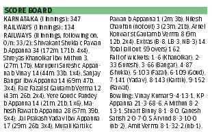 <p>It was just a matter of when rather than if. Having arrived at a sniffing distance of victory, Karnataka completed a comprehensive innings and 51-run win over Railways, just eight overs into the second session of third day’s play of the Group ‘A’ Ranji Elite Division match here at the Karnail Singh Stadium.<br /><br />KP Appanna, coming off a five-wicket burst in the first innings, once again proved the hosts’ nemesis claiming his maiden 10-wicket haul on Saturday. Unable to come to terms with the young bowler, Railways, overnight 33/2 after following on, tumbled to 162 all out to suffer their second big defeat in as many matches following a 10-wicket drubbing last week by Mumbai at the same venue. The innings win fetched Karnataka six points, including a bonus point. At the moment, the former champions are at the top of Group ‘A’ table with nine points, including the three against Rajasthan in their opener.<br /><br />On a wearing pitch, the Railways’ batsmen didn’t have either the skill or the fortitude, managing a match aggregate of 296 in reply to Karnataka’s first innings score of 347 all out that was mainly built on the aggressive 117 by Robin Uthappa. </p>.<p>If the dashing opener set up the match for the visitors with a crucial knock, his fellow Kodava finished off the job in style prising out 11 wickets for 107, including 6/68 in the second innings on the penultimate day. Unlike on Friday, when the 22-year-old got amongst wickets with the first ball he bowled, Appanna had to work a little hard for the first of his six wickets on the day. </p>.<p>Skipper Sanjay Bangar and overnight batsman Shivakant Shukla showed some positive intent to deny Karnataka any immediate success. The youngster was also guilty of getting into a defensive mode after the batsmen creamed him to the fence on a couple of occasions. Having lured the batsmen to their doom with flighted deliveries on a slow-turner, Appanna decided to go flat when Bangar and Shukla took him on.<br /><br />The 16-over resistance, however, ended when the bowler slipped in an armer, and hit Bangar low on the pads to win a leg-before appeal. This was the opening Karnataka needed to run through the home team’s line-up. A compact-looking Shukla was smartly snapped up at short mid-on by a diving KB Pawan, while Yere Goud’s stint came to an end six runs later, leaving Railways precariously at 141 for six.<br /><br />With Jai Prakash Yadav in an attacking mood, the only point of interest was if Railways, needing 72 more to make Karnataka bat again, would avoid the innings defeat. The slim hopes went up in smoke when Appanna trapped the veteran batsman in front with the first ball after lunch. <br /><br />Four balls later he prised out Murali Kartik to complete 10 wickets for the match. He wasn’t done yet though. Three overs later, the young spinner clipped Mahesh Rawat’s bails to dismiss the last of Railways’ recognised batsmen. Amit Verma then pulled the curtains down on the proceedings drawing last-man Arlen Konwar out of the crease for CM Gautam to effect his second stumping of the innings. A batsman light after packing the side with spinners to suit their designer track, Railways, yet to get amongst points this season, were left to rue their ploy. Karnataka now travel to Mumbai for their third match beginning November 17. This will be the first match between the two sides after the high-voltage final in 2009-10 in Mysore.</p>