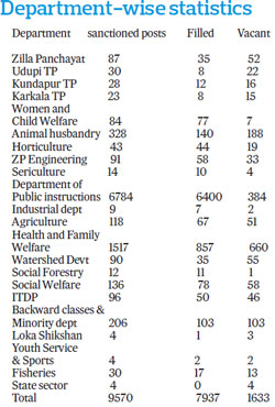 <p>In Zilla Panchayat and other departments under its jurisdiction, a total of 1,633 posts are lying vacant in Group A, B, C and D category. There are 660 posts lying vacant in district health and family welfare department. In department of public instructions, there are 384 posts lying vacant. There are 188 posts lying vacant in the department of animal husbandry and 103 posts in the department of backward classes and minority. <br /><br />In Udupi taluk panchayat, 22 posts are lying vacant and there is no staff in the audit section of the taluk panchayat, said TP EO. “We have severe shortage of staff in our department. We have to manage the show with the available staff. Who will listen to our problems,” said the staff in health department. As Udupi district is in good position when it comes to health sector, many of the primary health centres which were sanctioned to the district, have been shifted to other districts, said officials in health department. However, there is a shortage of doctors to serve in the rural areas. Due to vacant posts including that of a typist in the department, the horticulture department is finding it extremely difficult in implementing various programmes. Similarly, the Kundapur taluk has large area under watershed department. The department concerned has written to the Zilla Panchayat to fill the vacancies like agriculture officer and agriculture assistant. <br /><br />“The top officials want us to achieve the target. However, the sanctioned posts are lying vacant,” said an officer.<br /><br />“In the administrative report sent to the state government, we mention the shortage of staff in each and every department,” said Zilla Panchayat CEO Prabhakar Sharma to Deccan Herald. <br /><br />However, five to six staff will be recruited to watershed department soon, he added. <br /></p>
