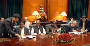 <p>IThe two neighbours have finalised a revised trade agreement and a treaty on controlling unauthorised trade.<br /><br />New Delhi and Kathmandu revealed the decision to review the 1950 peace and friendship treaty in a joint statement that was issued on Saturday – the last day of the Nepalese Prime Minister Madhav Nepal’s five-day tour to India. <br />The negotiators of both the countries failed to narrow down differences on the issue of reciprocity of re-export facility, but went ahead to finalise the Agreement of Cooperation to Control of Unauthorised Trade without inserting the contentious provision. <br /><br />New Delhi is reluctant to reciprocate Kathmandu’s offer of allowing India to re-export to Nepal imports from third country. The Ministry of Commerce in New Delhi anticipates that such a provision might turn Nepal into a transit point for export of Chinese products to India. The revised Treaty of Trade is expected to give a boost to the economic engagement by increasing the mutually agreed points of trade and result in both investment and employment generation. It aims at enlarging the scope of the existing institutional framework, under which India gives goods manufactured in Nepal duty-free access to its market.<br /><br />External Affairs Minister S M Krishna and Nepalese Commerce Minister Rajendra Mahato were present when commerce secretaries of both the countries initialed the agreements. The present trade between India and Nepal during the year 2008-09 (April-February) is US $ 1,862.02 million and is expected to go beyond US $ 3 billion.<br /><br />To help boost foreign trade of Nepal, India has also agreed to let its landlocked neighbour to use the Vishakhapatnam port in Andhra Pradesh for transit traffic. Nepal has already been using the port in Kolkata. New Delhi agreed to consider Kathmandu’s request for use of an additional sea port on the western coast for trade purposes.<br />The 1950 Treaty of Peace and Friendship between India and Nepal allows for free movement of people and goods between the two nations and a close relationship and collaboration on defence and foreign affairs. For New Delhi, the treaty is a tool to lessen Beijing’s influence on Kathmandu. But it has been drawing flak in Nepal, with the Maoists who now outnumber others in the Himalayan country’s Constituent Assembly demanding revision of the treaty.<br /><br />The decision to review the treaty was taken during a meeting between Prime Minister Manmohan Singh and the visiting premier of Nepal. According to the joint statement issued on Saturday, the two PMs directed the Foreign Secretaries to discuss and review the treaty and other bilateral agreements to strengthen the relationship between the two neighbours.<br /></p>.<table><tbody><tr><td> <br /></td></tr><tr><td> Secretary Commerce Rahul Khullar (R) with Nepalese Counterpart Purushottam Ojha (L) signing the agreemnet in the presence of External Affairs Minister S M Krishna with Commerce and Supplies Minister of Nepal Rajendra Mahato, during the signing of Indo-Nepal agreement ceremony in New Delhi on Saturday. PTI </td></tr></tbody></table>