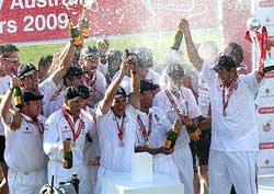 <p>After setting Australia an improbable target of 546 runs, the hosts wrapped up Australia's second innings at 348 at The Oval to clinch the series 2-1 and make Andrew Flintoff's swansong Test a memorable event.<br /><br />A packed Oval crowd erupted into celebration when spinner Greame Swann dismissed Michael Hussey to draw curtains on a keenly contested series between the arch-rivals.<br />Hussey stood tall amid the ruins with a valiant 121-run knock while skipper Ricky Ponting also batted bravely for his 66 before Flintoff effected his brilliant run out.<br /><br />Ponting suffered the ignominy of being the only the second Australia captain in 132 years of Ashes history to lose two series on England soil.<br /><br />The other was Australia's first touring captain Billy Murdoch a century ago. Murdoch lost his second series in 1890. <br /><br />Young paceman Stuart Broad was adjudged Man-of-the-Match award for his brilliant all round show.<br /><br />He took six wickets in the match including a five-wicket haul which triggered first innings collapse of Australia, who were all out for 160.<br /><br />He also contributed with the bat with the scores of 37 and 29 in the match.<br /><br />England captain Andrew Strauss and Australia's Michael Clarke were joint winners of the Man-of-the-Series award for their splendid show with the bat throughout.<br /><br />The visitors were going strong at one stage as they had moved to 217 for two from the overnight score of 80 for none.<br /><br />Skipper Ponting and Hussey put up 107 runs for the third wicket before Flintoff, playing the final Test of his career, broke the partnership with a brilliant direct hit.<br /><br />The early wicket of Clarke (10), who again was a run out victim, meant that England could get back the Ashes urn on the fourth day itself.<br /><br />A determined Hussey then joined hands with stumper Brad Haddin to frustrate the home fans as they stitched together a 91-run stand.<br /><br />Swann brought the smiles back when he had Haddin caught by Strauss at mid-wicket. Pacer Steve Hraminson then took two wickets in two balls and writing was clear on the board for Australia. <br /><br />Flintoff and Strauss had stunned Australia with two run-outs, the first they'd suffered this series, before tea to dismiss Ponting and Clarke.<br /><br />Ponting and Hussey had frustrated England with a third-wicket stand of 127 that raised hopes of an improbable victory.<br /><br />But Flintoff struck in unlikely fashion.<br /><br />Hussey called Ponting for a single off Harmison but Flintoff, running round from mid-on, threw down the stumps at the striker's end and Ponting was short of his ground by a foot.<br /><br />Ponting, in what could be his final Ashes Test in England, had to go for 66, having stroked 10 stylish fours in his 103-ball stay after he and left-hander Hussey had revived Australia from the depths of 90 for two.<br /><br />Vice-captain Clarke fell in even more extraordinary fashion.<br /><br />Australia's leading batsman this series, clipped a ball from Swann that deflected off the boot of Alastair Cook at short leg to leg-slip Strauss, who hit the stumps with a sharp under-arm throw.<br /><br />This was a much tighter call for third umpire Peter Hartley but he eventually ruled the bail was in the air with Clarke's bat still to be grounded.<br /><br />Clarke was out for nought and Australia, who'd lost two wickets for three runs in six balls, were now 220 for four. <br /><br />And they could have been five down had not Collingwood dropped Hussey, on 55, off Swann.<br /><br />But Australia were 236 for five when Marcus North, trying to sweep Swann, was smartly stumped by wicket-keeper Matt Prior.<br /><br />Australia resumed Sunday on 80 without loss.<br /><br />Left-hander Simon Katich had only added one to his overnight 42 when, padding up, he was plumb lbw to Swann.<br /><br />Three balls later, fellow opener Shane Watson (40) was lbw to man-of-the-match Stuart Broad.<br /><br />England consolidated Saturday the advantage gained from dismissing Australia for just 160, with Broad taking five for 37, in a second innings 373 for nine declared that featured a debut century from Jonathan Trott, who made 119.<br /><br />Strauss's declaration left the visitors needing to break the record for a successful Test fourth innings run-chase, of 418 for seven set by West Indies against Australia in Antigua in 2002/03, to win this match.<br /><br />England victory's left Ponting with the unwanted record of becoming only the second Australia captain, since Billy Murdoch in 1890, to be in charge of two losing Ashes tours of England.<br /><br />And it also knocked Australia off top spot in the Test rankings. <br /><br />Score board<br /><br />England v Australia fifth Test scoreboard<br /><br />England 1st Innings: 332 all out<br /><br />Australia 1st Innings: 160 all out<br /><br />England 2nd Innings: 373-9 dec<br /><br />Australia 2nd Innings (overnight: 80-0)<br /><br />S Watson lbw b Broad 40<br />S Katich lbw b Swann 43<br />R Ponting run out (Flintoff) 66<br />M Hussey c Cook b Swann 121<br />M Clarke run out (Strauss) 0<br />M North st Prior b Swann 10<br />B Haddin c Strauss b Swann 34<br />M Johnson c Collingwood b Harmison 0<br />P Siddle c Flintoff b Harmison 10<br />S Clark c Cook b Harmison 0<br />B Hilfenhaus not out 4<br /><br />Extras (b7, lb7, nb6) 20<br />Total (all out, 102.2 overs, 434 mins) 348<br /><br />Fall of wickets: 1-86 (Katich), 2-90 (Watson), 3-217 (Ponting), 4-220 (Clarke), 5-236 (North), 6-327 (Haddin), 7-327 (Johnson), 8-343 (Siddle), 9-343 (Clark), 10-348 (Hussey)<br /><br />Bowling: Anderson 12-2-46-0 (1nb); Flintoff 11-1-42-0 (1nb); Harmison 16-5-54-3 (4nb); Swann 40.2-8-120-4; Broad 22-4-71-1; Collingwood 1-0-1-0</p>