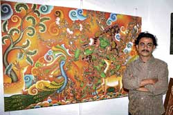 <p>Kerala Mural Magic, the latest work of Prince Thonnakkal is on display at Renaissance Gallerie till August 29. <br /><br />Prince’s mural paintings are inspired by the Hindu mythology. Some contemporary paintings are also on show. <br /><br />The artist has visualised modern people, materialistic things and those that grab his attention. He then gives shape to them in the form of murals. <br /><br />He has based the murals on Pancha Varnas and on the exact measurements which should be used when doing mural paintings. Prince has been painting for the last 15 years. He uses colours which are often prepared from natural materials like terra verte, red ochre, chalk, and yellow-ochre. <br /><br />What began as a hobby, slowly transformed into a profession for Prince. <br />He is into ‘releef work’ which is done on fibre and cement which are thick and camouflaged well. <br /><br />Prince Thonnakkal says, “The base of the Indian system of murals is found in texts or treatises like Chitrasootram in Vishnudharmotharam, Someswara’s Abhilasha Chintamani, Manasollasa, Naradashilpashastra, Kashyapashilpa, Bhoja’s Samaranganasootradhara and Sreekumara’s Shilparatna. My works have managed to release murals from the bondage of past and has made it relevant in present.” <br /><br />Murals are man’s etchings on the walls of history that is how they have been existing in Ajanta caves, in temples and churches it has always existed on the walls and Prince has replicated and experimented on them. He later slapped these murals on canvas. <br /><br /> Saritha, a visitor said, “The paintings are unique. They have a different effect and set a new trend. The ‘releef work’ has a rich ethnic look and adds colour to wherever it is put up.”<br /><br /></p>