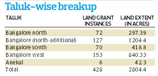 <p>An internal drive by the Revenue Department to check the authenticity of land grant instances in and around Bangalore has revealed that land sharks have grabbed 2,804 acres of government prime land worth more than Rs 5,000 crore in the real estate market, by creating fake documents. </p>.<p>The exercise was taken up in September last, following suspicion raised by the Task Force for Protection of Government Lands headed by former additional chief secretary V Balasubramanian that thousands of acres of government land in Bangalore (Urban) had been encroached upon using bogus documents. <br /><br />In all, the department has found 428 cases of concocted land grant files in the five revenue taluks coming under the Bangalore Urban district- Bangalore (north), Bangalore (north - additional), Bangalore (south), Bangalore (west) and Anekal. A land grant is a gift of real estate from the government usually to agriculturists under various enactments from time to time. The enactment prevailing as on date is the Karnataka Land Grant Rules, 1969.<br /><br />In September last, it was noticed that in many land grant files maintained at the DC’s office, there were no records pertaining to eligibility for grant, availability of land, and reports and recommendations from the taluk office as required under Karnataka Land Grant Rules. In September last, the office of the Special DC, Bangalore Urban, identified as many as 1,167 instances pertaining to a total of 9,900 acres where there was an element of doubt regarding the authenticity of documents. <br /><br />As many as 60 teams were constituted to verify documents pertaining to these instances. Inputs from these teams were used by a committee headed by the Bangalore (urban) deputy commissioner and after scrutiny, 428 cases of the 1,167 instances were confirmed as fraudulent.<br /><br />Null and void<br /><br />The committee - in its report submitted to the principal secretary, revenue department - has recommended that the government immediately take possession of the 2,804 acres and declare the possession by claimants as null and void. <br /><br />It has further recommended that jurisdictional tahsildars file criminal cases against persons who had illegally transferred government land to their names under Section 192 (A) of the Karnataka Land Revenue Act. <br /><br />Conviction by a judicial magistrate first class under this clause is punishable with an imprisonment for three years and a fine of up to Rs 10,000.<br /><br />The committee found that in several cases, the land grant lacked supporting documentation. <br /><br />The basic proof for land grant is the entry made in dharkhast register and saguvali chits register maintained in the taluk office. In addition, the applications for land grant have to be verified by the taluk office regarding eligibility and local enquiry made by revenue inspectors regarding objections, among others. <br /><br />However, it was found that even though there was no land grant made, revenue officials had made entries in the RTC forms.<br /><br />Bangalore (north-additional) taluk has the highest land grab cases with 1,204 acres being gobbled by 609 persons in 41 villages. <br /><br />In Bangalore West taluk, which has developing areas like K R Puram and Varthur, Bidarahalli, 840 acres had been grabbed using bogus documents.</p>