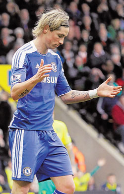 <p>Chelsea wasted the chance to get back into the Premier League title race after Norwich City defended resolutely to earn a 0-0 draw at Carrow Road on Saturday, their frustrations increased by an injury to midfielder Frank Lampard. <br /><br /></p>.<p>Fourth-placed Chelsea moved to 41 points, 10 behind leaders Manchester City who face third-placed Tottenham Hotspur at home on Sunday. <br /><br />Lampard tore a muscle and came off after 37 minutes in the lunchtime kick-off. <br />The visitors had better scoring chances but Spain striker Fernando Torres, who has now gone nearly 15 hours without a goal, fluffed the best one of the 18 they created when he sliced wide shortly being substituted late in the game. <br /><br />Norwich underlined their right to a place among the elite after winning promotion with a sound defensive display, their first clean sheet of the season, and the point kept them in ninth place on 29 points, at least until the seven afternoon matches were scheduled to take place. <br /><br />Norwich ’keeper John Ruddy was in outstanding form with a series of good saves while striker Grant Holt went closest for his side in the first half. <br /><br />Chelsea manager Andre Villas-Boas, who delayed giving new signing Gary Cahill his debut, said that Chelsea should have done better and a point was not enough. <br /><br />“It was a frustrating day because we were dominant, particularly in the second half, but just couldn't find the net,” he told Sky Sports. <br /><br />“I thought John Ruddy was magnificent for them and for the co-ordination of his defence, but for our progress in the league a point is not enough.”<br /><br />Regarding Torres 15th successive appearance for Chelsea without a goal, he added: “He had good chances and to have good chances you have to position yourself well, and with a bit more luck he will find the back of the net.”<br /></p>