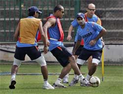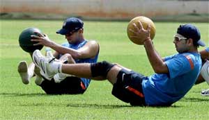 <p>But considering that the batsmen, particularly Suresh Raina, spent a considerable amount of time in the nets honing their skills against the short-pitched stuff -- both from humans and the bowling machine -- on the second day of the four-day preparatory camp, it was clear that the think-tank has indeed taken the issue seriously.<br /><br />Raina, castigated along with Rohit Sharma for his inability to cope with the short ball, received special attention not just from Kirsten but also Sachin Tendulkar at the National Cricket Academy here on Friday. After every set of about 6-7 balls, the duo would point out the left-hander’s weaknesses and suggest the adjustments he needed to make. <br /><br />Raina’s exaggerated movement while avoiding the ball prompted Tendulkar to walk up to the youngster and give him some lessons in the art of leaving the ball. <br /><br /></p>.<p>As a boxer would evade a punch in the ring with a little but brisk movement of his head, Tendulkar even demonstrated to the UP batsman to how to let go the ball without losing one’s balance. Kirsten in fact walked up to Raina thrice in the nets to point out where he was going wrong.<br /><br />It was, however, not just Raina who was put through the grind. Rahul Dravid, primarily in the side for his proven ability to negate the short ball, skipper MS Dhoni, Yusuf Pathan and Abhishek Nayar, among others, tested their strength against a harder tennis ball coming out of the bowling machine at rapid pace. Not surprisingly, with the exception of Dravid and to an extent Dhoni, it took some effort from other batsmen to negotiate the missiles.<br /><br />Returning to the one-day fold after nearly two years, Dravid showed his adeptness at both pulling and leaving the ball, a skill Raina would love to own. Kirsten also made the Bangalorean face the tennis ball coming at a high speed with the spin imparted though a tennis racquet, the only time when Dravid looked in any sort of trouble.<br /><br />The afternoon session, devoted to nets, began with Dravid, Dhoni and Gautam Gambhir beginning the proceedings on pitches of various nature laid out at the academy’s outdoor facilities. Dravid and Dhoni batted on ‘pacy’ tracks while Gambhir practised on the ‘turning track.’ The three then switched pitches before the second set of batsmen -- Tendulkar, Yuvraj Singh and Raina -- followed the routine.<br /><br />Nayar, the last batsman to leave the scene along with Dinesh Kaarthick, had an extended batting session, Kirsten, as expected, spending time sorting out the Mumbaikar’s problems against the short ball.<br /><br />The day had begun with a warm-up session followed by a game of football before the players were divided into small groups for a fielding session. Overseen by Kirsten, bowling coach Venkatesh Prasad, fielding coach Robin Singh, mental conditioning coach Paddy Upton and trainer Ramji Srinivasan, the three-hour exercise didn’t include anything out of the ordinary.<br /><br />After the fielding stint, some of the players, including Dhoni, Yuvraj and Dravid, played another game of football before breaking for lunch. </p>.<table><tbody><tr><td></td></tr><tr><td>Rahul Dravid and Yuvraj Singh exercise <br />during Team India's fitness and conditioning camp, ahead of Tri-Series and Champions trophy, at Chinnaswamy Stadium in Bangalore.<br /></td><td> Coach Gary Kirsten, background right, and cricketers, from left, Abhishek Nayar, Yousuf Pathan and Dinesh Karthik play a game of soccer. AP<br /></td></tr></tbody></table>