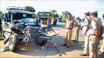 <p>Eight people were killed in a head-on collision between a sports utility vehicle (SUV) and a State road transport corporation bus at Itagi village on the Shimoga-Hospet national highway in Huvinahadagali taluk past midnight on Monday.<br /><br /></p>.<p>A group of villagers from Davangere were on their way to Tinthani Mouneshwar temple jathre in Surapur taluk of Gulbarga district in the SUV. The bus from Raichur was on its way to Sagar in Shimoga district.<br /><br />Victims<br />Srinivas Pattar (58), Nagaraj Achar (48), Gopal Achar (48), Bhadrachar (48), SUV driver Mouneshachar (30) and Dronachar (45) died on the spot, while Mallikarjuna Achar (52) died at the Itagi Primary Health Centre and Kotresh Achar died at the Chigateri General Hospital in Davangere.<br /><br />Six others who suffered serious injuries have been admitted to the Davangere Hospital. Within minutes of the collision, villagers arrived at the spot and helped in retrieving the bodies from the SUV.<br /><br />Driver arrested<br />The police have arrested the driver of the bus on charges of rash and negligent driving.<br />East Range Inspector General of Police (IGP) Sanjay Sahai, Bellary SP Chandragupta, DySP Nagaraj and CPI Srikanth Kattimani visited the spot.<br /></p>