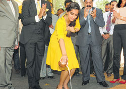 <p>The launch ceremony of a swanky new upcoming mall was held in town and the launch sure did reflect what was in store.<br /><br /></p>.<p>Despite the hour-long delay, that is almost expected with a star-studded event, Sonam Kapoor appeared on stage without much cue. <br /><br />The fashionista stood pretty in a yellow knee-length dress and animal print heels. With bare minimum accessories Sonam seemed quite at ease and in sync with the others at the event. <br /><br />Besides the style icon who was brought down from Mumbai especially for the launch, actor and anchor Mandira Bedi was seen on stage playing emcee. Mandira wore a short blue-green dress with bold black heels and introduced those on stage.<br /><br />After some short felicitation rituals, everybody moved ahead to the puja mandap where the ceremony was to be held. George and Chitra Thangaiah, the owners, along with Nitesh Shetty and Sonam Kapoor performed the rituals. Sonam got chatty with the owners and a few others around.<br /><br /> On returning, she unveiled a few pictures of the upcoming mall to give people a glimpse of what is coming their way in future. Following this, comedian and actor Ash Chandler took the stage and entertained the audience with his brand of humour. While most of his jokes did see the audience crack up, there were some regional ones which were greeted with no more than silence. <br /><br />Chandler, who has previously worked in films like Guzaarish, also displayed his vocal skills and broke into a song before many realised. <br /><br />Following Chandler, it was the ladies’ turn. Mandira Bedi returned on stage and called upon Sonam again for a small rapid fire round, where Sonam had to reveal many things about herself which included her favourite brand and what it is that made her take to fashion with a frenzy. The audience cheered on as Sonam attempted to be as modest as she could through these questions. <br /></p>