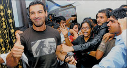 <p>It is incredible to see what starstruck fans can do when they come face-to-face with their favourite actors.<br /><br /></p>.<p>A girl in Mangalore was so ecstatic when John Abraham walked past her that she tried to grab his arm and bite him! The shocked actor reacted by slapping her.<br /><br /></p>.<p>The incident occurred during the inauguration of Euro Gold Jewellery showroom and Asmi Diamond showroom at Kankanady on Sunday.<br /><br />The inauguration was scheduled for 10.30 am, but eager fans started gathering in front of the showroom at 10 am itself.<br /><br />By noon, there were as many as thousand spirited, sloganeering fans in front of the showrooms with colourful balloons and crackers.<br /><br />All hell broke lose when John arrived at 12.15 pm. As soon as he alighted from his car, the fans rushed to catch a glimpse of the star making it near impossible for the police and private bodyguards to control the crowd.<br /><br />The police soon had to resort to lathi charge to disperse the crowd. Undeterred, some fans pushed their way through to shake hands with the actor, who was forced to use his muscle power too to push some of the fans away.<br /><br />At this point, a girl tried to grab John and bite him, and was at the receiving end of the ‘memorable’ slap.<br /><br />The actor later managed to get inside the showroom and inaugurate it. Chief Minister D V Sadananda Gowda’s wife Datty inaugurated the kids section. A press meet that was scheduled post the inauguration was cancelled.<br /><br />Despite the real-life drama, the fans still followed the actor through the day and even called it “memorable”.</p>