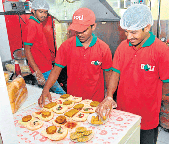 <p>Two shops of Goli - one at the intersection of Narayanashastry Road and M N Jois road and the other at V V Mohalla fifth main near State Bank of Mysore - are becoming a place to guzzle down large variety of Vada Pavs, writes Manish</p>.<p>A part from numerous eateries, which cater to the cravings for food, on Narayanashasry road, a relatively new shop - Goli Vada Pav No 1 - has become a huge hit among residents in the neighbouring areas. Located on a corner at the intersection of M N Jois road and N S road, ‘Goli’ has become the favourite haunt of many foodies. <br /><br />A steady stream of customers place their order choosing between a variety of snacks, which originated in Maharastra as the cheapest meal for people from the working class. However, with time the snack has become synonymous with breakfast, brunch and also an even snack in Maharashtra, especially the financial capital Mumbai.<br /><br />For Naga Thilak, a native of Mysore who later went on to reside in Bangalore, a bite of Vada Pav during his pilgrimage to Shirdi was reason to start a chain of stores in Karnataka’s capital city. Having seen that cleanliness and hygiene was given the utmost importance, he thought of becoming a franchise for Goli Vada Pav, which has more than 100 outlets in the country. The first Goli store was opened inside the Infosys campus and later another was opened at Fifth Main, V V Mohalla, near State Bank of Mysore.<br /><br />The latest was opened on N S Road by a cousin of Thilak, Srinivas. Speaking to City Herald, Srinivas said Goli offers a large variety among which the most sought after are the Cheese Fingers, Vada Pav and Palak Makai Vada Pav. A majority of customers are the youth crowd, people who wanted 100 per cent vegetarian can grab a quick bite here.<br /><br />The Palak Makai Vada Pava is a blend of mashed potatoes, sweet corn and spinach, which is served with veg mayonnaise sauce. The Cheese Fingers are a combination of cheese, mashed potato and bread coated flavored with white pepper. The Goli Vada Pav shops are open from 11 am to around 10.30 pm.</p>.<p>Vada Pav, Schezwan Vada, <br />Aloo Tikki Vada Pav, Mixed Veg Vada Pav, Masala Vada Pav, Palak Makai Vada Pav, <br />Sabudana Vada, Cheese Fingers, Cheese Vada Pav, <br />Cheese Schezwan Vada Pav, <br />Cheese Aloo Tikki Vada Pav, Cheese Mix Veg Vada Pav, <br />Cheese Palak Makai Vada Pav. </p>