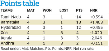 <p>As the South Zone one-day tournament reaches its business end with Sunday’s final set of matches, the battle for the Subbaiah Pillai Trophy remains very much between Karnataka and Tamil Nadu, despite Hyderabad’s early promise. <br /><br />From Goa being shot out to 54 by Karnataka on the opening day to Andhra chasing down an incredible 383 against the same Goan outfit on Friday, this year’s tournament has thrown up some extraordinary results. Sandwiched between these two heart-breaks for Goa was their upset win over Tamil Nadu. <br /><br />The minnows had done a huge favour to Karnataka by stunning Tamil Nadu on the second day of the tournament, but the hosts may just have squandered a golden opportunity to lay their hands on the Trophy after losing to the defending champions, and conceding a bonus point, in their third match. Though Karnataka stay in contention for top honours after a comprehensive 103-run win over Hyderabad on Friday, Tamil Nadu, at the moment, appear to have a better chance of emerging champions for the fourth time in a row. </p>.<p>After four matches each, both Tamil Nadu and Karnataka have three wins and a loss each, but the former have won all their matches with a bonus point to stay a point ahead of the home team at 14. While Karnataka failed to earn the bonus point against Kerala, they couldn’t deny Tamil Nadu the bonus point, thus jeopardising their chances of regaining the title they last won in 2007-08. <br /><br />Karnataka’s immediate target, however, will be to qualify to the all-India one-day tournament for the Vijay Hazare Trophy as one of the top two South Zone teams. A simple win against Andhra at the Chinnaswamy stadium will ensure them a place in the knockouts, but is the task that simple actually? The way Andhra hunted down Goa’s close to 400-run total shows Karnataka can ill afford to take their victory for granted. <br /><br />With the number bonus points going to be crucial in deciding the champions in case of teams being level on points, Karnataka will be targetting the same while hoping for a favour from Hyderabad, who take on Tamil Nadu in their last encounter. <br /><br />A resurgent Hyderabad have showed they have the potential to be party poopers and Tamil Nadu would be aware of the challenge ahead of them. The Lakshmipathi Balaji-led side will have to win with a bonus point to neutralise Karnataka’s claim in case Robin Uthappa and company collect their full complement of five points against Andhra. <br /><br />While another set of five points will leave Tamil Nadu with an unassailable 19 points, a simple win will tie them with Karnataka on 18. Should there be such a situation where both teams are with equal number of wins and bonus points, Karnataka won’t be complaining much as they enjoy a very healthy net run-rate (the third factor to decide the champions) of 1.46 as aganst Tamil Nadu’s 0.59.<br /><br />Karnataka will be hoping injured Stuart Binny recovers in time for the crucial match as the all-rounder provides the much-needed meat in the middle-order besides chipping in with a few meaningful overs. <br /><br /></p>