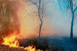 <p>Two fire accidents have been reported on Sunday in Hassan. The first incident was reported at an eucalyptus groove under Hongere range forest. The other was a fire accident at a poultry farm in which 15 coconut trees were gutted.<br /><br /></p>.<p>Fire was spotted at the eucalyptus groove near Shantigarma at around 1 pm. With a lot of dry eucalyptus leaves, fire spread briskly.<br /><br /> Only one staffer of the forest department was seen dousing the fire in vain.<br /><br />Clarification<br /><br />“There was no forest fire in Hongere. Fire was lit to weeds in the border of the forest, which spread to dry eucalyptus leaves. There has been no great loss,” said forest officials.<br /><br />The fire mishap in Gaadenahalli has gutted around 15 coconut trees and old construction materials in the compound of poultry farm of one Godwin.<br /><br />The fire which was lit to hay in the neighbouring fields spread to the farm, said Godwin.<br />Fire personnel had to struggle to bring the situation under control.<br /></p>