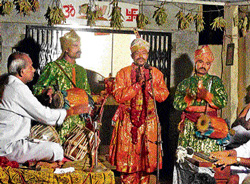<p>A L Venkatesh is a folk artiste who holds the mantle of carrying on the tradition of culture and folk arts from his predecessors. “My grandfather Ramaiah was a director of plays. My father Akkinipalli Lakshman Bhagavatar was a Haridasa and a poet. I practice and perform the art of Burra Katha. </p>.<p>My son A V Guru, who is in the sixth standard can perform Burra katha for at least three hours”, says Venkatesh.<br /><br />Burra katha is a popular form of folk art in Andhra Pradesh and border areas of Karnataka. It is a narrative entertainment that consists of prayers, solo drama, dance, songs, poems and jokes. The topic will be either a Hindu mythological story or a contemporary social problem.<br /><br />Burra katha stories fall into three categories - mythological, historical and sociopolitical. Although the form was originally improvised, today popular stories have been written down and committed to memory by performers. <br /><br />In this theatrical form, a storyteller accompanied by his partner gives recitals for two or three days. He sings dances and recites a story, before the people of a village under the patronage of a village elder.<br /><br />The term ‘burra’ refers to ‘tambura’, a stringed instrument worn across the right shoulder of the performer.<br /><br />The main performer plays the tambura with his right hand as he dances rhythmically forward and back on the stage while reciting a story. The performer also wears over his right thumb, a hollow ring in the palm of his hand. With the rings, he beats the basic tempo of the songs. <br /><br />At regular intervals during the narration he responds to his co-performers, two drummers who play two-headed earthen drums. The drums produce a distinctly metallic sound to accentuate the songs and are regarded as an indispensable ingredient of Burra katha performance. <br /><br />The drummer to the right of the performer is the ‘rajkiya’. He comments on contemporary political and social issues even if the story concerns historical or mythological events. The drummer on his left, the ‘hasyam’, cracks jokes and provides comic relief.<br /><br />Performance begins in the evening with devotional songs in praise of various celestial beings. Then the performer introduces the main story by establishing the place, time and historical context of the action. During this the rajkiya and hasyam repeat the refrain of the narrative. <br /><br />When the introduction is concluded, the main plot begins in which all three performers take an active role assuming various characters in the incidents, as well as providing narrative bridges between incidents. Dance, recitation, song and enactment of scenes provide variation within a strong narrative line. Generally a story continues for two to three hours. A longer work may be serialized into several consecutive evenings.<br /><br />Recently in Tammanahalli temple there was an all night performance of a Burra katha, “The life history of Kaiwara Thathaiah.” Thathaiah or Naranappa was a 18th century saint who lived in Kaiwara in Chikkaballapur. </p>