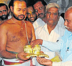 <p>Deputy commissioner of Chamarajanagar district K R Sundar on Tuesday clarified that various tests done to check the authenticity of the ‘padukas’ (mould resembling legs) of the deity Biligiri ranganathaswamy has revealed that it is real gold.<br /><br /></p>.<p>The gold ornaments that were kept at the sub treasury were brought to be used during Brahmotsava celebrations that were held on May 4. <br /><br />There was confusion on Monday when some people raised doubt on the authenticity of the padukas, after which it was brought to the notice of the higher officials.<br /><br />A three-member team of experts under the guidance of assistant commissioner A B Basavaraju took up the verification and has given a clean chit.<br /><br />The padukas were donated by Jahagirdar in 1937. Each paduka weighed 344 gms earlier and the verification done now showed that it weighed 339 gms, according to assistant commissioner.<br /><br /> The difference in weight may be due to usage as the metal tends to wear off on continuous use.<br /><br />He said unnecessary tension created by some who claimed that the ornament has been replaced, has caused anxiety among the devotees. Legal action would be taken on them, he added.<br /><br />Tahsildar Shivanagaiah, temple executive officer Venkateshprasad, Sub inspector Mahadevanayaka and others were present.<br /></p>
