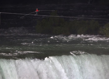 <p> A daredevil American, Nik Wallenda, today became first person in the world to walk on a tightrope across the roaring Niagara Falls, separating US and Canada.<br /><br /></p>.<p>A high-wire artist Wallenda, 33, defied predictions of naysayers who warned him of everything from falcons to fierce winds toppling him as he braved heavy winds and heavy spray taking just under 30 minutes to cover the 1,800 feet distance across the mist-fogged brink of the falls.<br /><br />Egged on by hundreds of thousands of people watching him from the Canadian and US sides of the falls, Wallenda gingerly walked on a cable suspended 196 feet over a never-before traversed rim of the biggest waterfall in the North America.<br /><br />"I feel like I'm on cloud nine right now," he said at a news conference minutes after completing the walk.<br /><br />"The impossible is not quite the impossible if you set your mind to it."A member of the family of famed high-wire walkers Wallenda family, Nik said he had from childhood dreamt of pulling off the stunt, never before attempt.<br /><br />Other attempts have been made to wire-walk acroos the Niagara, but they have all been downstream.<br /><br />Wallenda started his dream walk from the American end and arrived on the Canadian side, waving to his fans.<br /><br />Attempts to cross the falls are strictly forbidden, but the authorities made an exception for Wallenda, who is a descendant in a long line of acrobats and circus performers.<br /><br />Wallenda said the first thing he did after the walk was to call his grandmother to let her know that he had done it.</p>