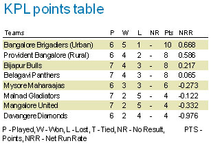 <p> <br />In an all-important match, Provident Bangalore (eight points) will face Mysore Maharaajas and a win will propel the former into semis with 10 points. <br /><br />In such a situation, Maharaajas will be eliminated with six points while Bijapur Bulls and Belagavi Panthers, both tied on eight points, will progress to the last four stage, completing the line-up. In a more complex scenario, if Mysore wins over Provident, it will leave four teams – Maharaajas, Provident, Panthers and Bulls — tied on eight points, bringing the net run rate into equation to decide the three other semifinalists.<br /><br />Among the four, Provident lead the run rate table at present with 0.586 with Bulls at second spot with 0.217. <br /><br />Panthers have a net run rate of 0.065 while Mahaarajas are a distant fourth with -0.273. Given their poor net run rate Mysore, it appears, have a mountain to climb, for they have to score a huge win to move up on the table. The other match on Monday, between Bangalore Brigadiers and Shamanur Davangere Diamonds, will be of mere academic interest as the former have already reached the semifinals, and Diamonds can only swell their tally to six points even if they manage to beat the Bangalore side.<br /><br /></p>
