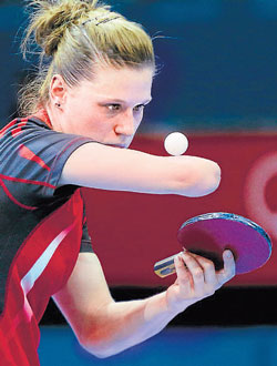 <p>When Polish table tennis player Natalia Partyka prepares to serve you realise just how impressive she is. <br /><br /></p>.<p>The 23-year-old was born without a right forearm and has to carefully balance the ball in the folds of skin at the end of her elbow before dropping it on to her swishing bat. <br /><br />She is one of only two people scheduled to compete in both the Olympics and its Paralympic cousin this year, the other being South African blade runner Oscar Pistorius. <br /><br />"For me, it (disability) is nothing," she told reporters after losing her third round match to Netherlands' Jie Li. "I am playing the same lines as the others. I am doing the same exercises,’’ she added. <br /><br />"We have the same goals and the same dreams and I can play like them. I can serve and don't have any problems,’’ Partyka said. "I get a bit bored about being asked about disability all the time,’’ she added. <br /><br />She is happy, however, if her achievements act as an inspiration to others. "Maybe someone will see me and realise that their own disability is not the end of the world," Partyka said. <br /><br />"Maybe someone will look at me and think they can achieve something bigger than they thought. Maybe sometimes you have to work a little bit harder if you really want to do something. If I'm an inspiration I can't complain,’’ she said. <br /><br />Her individual Olympic campaign was ended when she gave away a two-game lead to lose 4-2 but she still has the team event to come and then she must defend the Paralympic title she won four years ago in Beijing.</p>