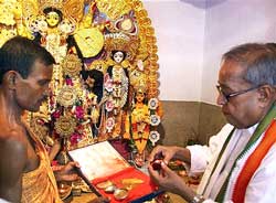 <p>Wearing the pattabastra (a silk cloth worn for worshipping the deity), Mukherjee performed the puja rituals Friday and Saturday and read from the religious script "Sree Sree Chandi" at Miriti village, two km from this town in Birbhum district and about 200 km from Kolkata.<br />He fasted till all the rituals were over.<br /><br />However, unlike in the past, Mukherjee did not go to the village pond to fill a pitcher, a ritual that started the prayers on Mahasaptami Friday.<br /><br />Mukherjee has been performing the worship for the four-day autumnal festival - the biggest religious celebration for Bengalis - for years. He usually comes home to 'Mukherjee Bhavan' on Shasthi and stays there till the immersion of the idols on Vijaya Dasami - which falls on Monday this year.<br /><br />This year, the key troubleshooter of the centre's United progressive Alliance (UPA) dispensation is staying in his sister's home in this town and has kept aside all political and economic issues during the puja days.<br /><br />The Durga Puja celebrations at Mukherjee Bhavan were started by the finance minister's grandfather more than 100 years back.<br /><br />A thick security cover has been thrown in and around the village in view of a threat perception to the minister from the Maoists who have pockets of influence in the district.</p>