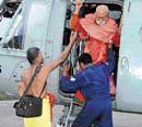 <p>He was airlifted to the Sri Raghavendra Swamy Mutt located at Jawahar Nagar here. <br />Scores of devotees too were trapped for hours in the town marooned by the overflowing Tungabhadra river. They were later rescued by IAF and emergency personnel. Many train services, including the Rajdhani Express, have been hit as tracks have been washed away. Road and communication links too have snapped.<br /><br />20 feared buried alive<br /><br />Meanwhile, around 20 people were feared dead in a landslide at Madibagh in Karwar taluk on Friday following torrential rain. According to reports reaching here, seven houses situated at the foothill caved in following a heavy landslide. Rain and darkness have hampered rescue operations. The identity of those buried in the landslide is not yet known.</p>