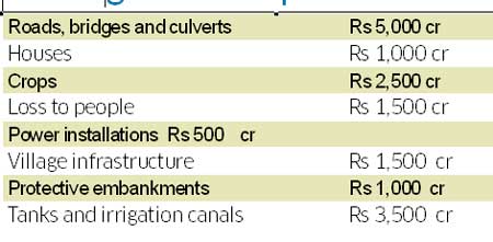 <p>This is only a preliminary assessment by the State Government, and the actual loss may be much more.<br /><br />In a memorandum submitted to the Union Home Minister P Chidambaram during his visit to Bellary on Monday, Chief Minister B S Yeddyurappa has sought Rs 10,000 crore from the Centre as interim relief to restore damage caused to infrastructure in the affected areas.<br /><br />The State government, as per the memorandum, has suffered a huge loss due to widespread damage caused to roads, bridges, culverts (Rs 5,000 crore), tanks and irrigation canals (Rs 3,500 crore). The crop loss is estimated to be Rs 2,500 crore. The preliminary assessment was done as per the statistics available till October 4 evening, the memorandum stated.<br /><br />The CM has urged the Centre to declare the disaster as a National Calamity, considering the severity, vastness of the affected area and distress caused to lakhs of people. Besides, he has asked the Centre to immediately send a team to conduct an actual assessment of the damages.<br /><br />Further, the CM said 1,211 relief camps were opened and nearly 3.55 lakh people were being provided with food and shelter. So far, 20 lakh food packets have been distributed in the affected districts.<br /><br />Addressing the media, Home Minister V S Acharya said the floods have wrecked havoc to village infrastructure like drains, roads, school buildings and community utilities. Drinking water supply system is washed out in almost all villages. <br /><br />Meeting<br /><br />Chidambaram has invited the State government for a meeting on October 8 in Delhi in this regard. The CM, his senior cabinet colleagues and top officials, including the Chief Secretary will attend the meeting, Acharya said.<br /><br /><br /><br />Damage break up<br /><br /><br /></p>