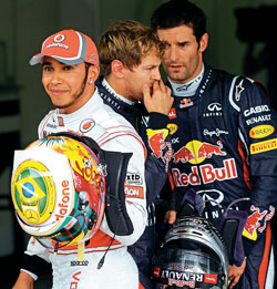 <p>Lewis Hamilton grabbed pole position in Brazil on Saturday for his last race with McLaren while Red Bull's Sebastian Vettel took a big step towards becoming Formula One's youngest triple champion. <br /><br /></p>.<p>Championship leader Vettel will start Sunday's season-ending race in fourth place, a position good enough to secure his third title in a row if he keeps it in what promises to be a rain-lashed affair at Interlagos. <br /><br />Ferrari's Fernando Alonso, 13 points adrift of Vettel and the German's sole rival, has to finish on the podium to have any hope of taking his third title and the Spaniard has a mountain to climb from seventh on the grid. <br /><br />Vettel, 25, made clear he would not be playing it safe despite his grid position. <br />"As soon as the lights go off I will try to attack the guys at the front. On top of that there might be things happening, with the weather forecast being what it is, so I won't be looking left and right to be honest," said the German. <br /><br />Vettel will have Australian team-mate Mark Webber starting alongside him in third place with those positions likely to be swapped soon enough. <br /><br />Alonso qualified eighth but moved up a place when Venezuelan Pastor Maldonado, who was sixth, was handed a 10-place penalty for missing a weighbridge in the second phase of qualifying. <br /><br />The stewards handed Maldonado a reprimand for the offence but also imposed the grid drop because it was his third reprimand of the season. <br /><br />Alonso can also count on the support of Brazilian team-mate Felipe Massa, who qualified fifth but is sure to let the title contender go past when the opportunity arises. <br /><br />"Given how the last few races have gone, my chances of making it to the podium are still intact," said the 31-year-old Alonso. "In the dry we are not competitive, but in the wet the car performs well sometimes and we are a little more comfortable,’’ he added. <br /><br />Hamilton's pole, the 26th of his career, was McLaren's first in Brazil since Mika Hakkinen in 2000 and the Briton will start next to Jenson Button in the team's 62nd front-row lockout. <br />"I think the weather will be tricky, it will make it more of a lottery," said Hamilton, who is moving to Mercedes next season after what will be an emotional farewell to a team that has been part of his life since he was 13 years old. "We've put ourselves in a really good position to do the best job we can do,’’ he added. <br /><br />Qualifying started after a light rain shower and with overcast skies, but the track was drying through the session without a feared downpour.<br /> <br />Germany's Nico Hulkenberg, who was on pole at Interlagos in 2010 for Williams in weather-affected conditions, will start sixth in his last race for Force India before moving to Sauber. <br /><br />Finland's 2007 champion Kimi Raikkonen put his Lotus in eighth place with Germany's Nico Rosberg in ninth for Mercedes and Force India's Paul Di Resta rounding out the top 10 after Maldonado's penalty. <br /><br />Raikkonen's team-mate Romain Grosjean was the big loser from qualifying after tangling with the HRT of Spaniard Pedro De la Rosa in the first phase and ending up 18th. <br /><br />"I was behind Pedro for the whole lap, he had blue flags. I went to overtake him and I don't think he saw me, I braked as much as I could but we made contact," said Grosjean. <br /><br />"In those colder conditions it was difficult to get the tyres up to temperature for the final lap,’’ he added. Seven times world champion Michael Schumacher will start his last Formula One race in 13th place for Mercedes, ending a three-year comeback at the age of 43 and with little hope of waving goodbye from the podium. <br /><br />"For obvious reasons, I am not particularly happy about the qualifying session today (Saturday)," he said. <br /><br />"Coming from where I am does not make it easy but I will definitely try to fight my way up the field,’’ Schumacher added.</p>
