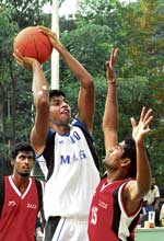 <p>MEG’s Sirajuddin (centre) attempts to shoot past Sports Hostel’s Jairaj in the State ‘A’ Division basketball championship in Bangalore on Friday. DH photoHASC, who were brought down to earth in last weeks loss to Controllerate of Electronic Inspection, found help in Markesh (16) and Sachindra (15). They jumped into an early 21-11 lead at the of the first quarter and showed no signs of stopping when they secured a 36-20 lead at half-time. Sujan was the sole major scorer for JSC with ten points but his effort went to wane as HASC rallied to complete the formalities.<br /><br />Meanwhile, KSP managed to hold off Ambedkar BC with a narrow 58-56 win. Ramakrishna (19) and Santosh (16) scored for KSP while Ambedkar relied on Nandith Chowdary (21) and Aravind (10).<br /><br /><br />Results: HASC: 53 (Markesh 16, Sachindra 15) bt JSC: 42 (Sujan 10). HT: 36-20; ASC: 72 (Atheef 18, Kannan 15) bt CMP: 52 (Nesa Raja 23, Vinay 13). HT: 34-22; MEG & Centre: 70 (Sirajuddin 23, Lloyd Antony 13) bt Sports Hostel: 48 (Jairaj 19, Varun MR 13). HT: 33-18; Vijaya Bank: 61 (Roshan 12, Ashrafali 10) bt Young Orions: 37 (Anirudh 11). HT: 26-13; KSP: 58 (Ramakrishna 19, Santosh 16) bt Ambedkar BC: 56 (Nandith Chowdary 21, Aravind 10). HT: 29-33</p>