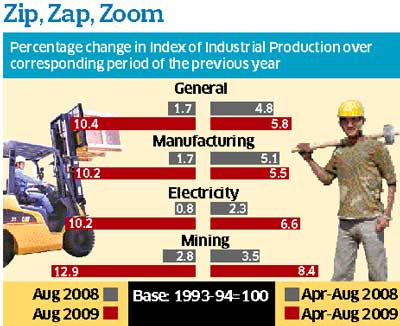 <p>This “spectacular” surge in the Index of Industrial Production in August, considered to be the fastest in the last 22 months, was spurred by an impressive double-digit growth in key segments like mining, manufacturing and electricity. An upbeat Planning Commission Deputy Chairman Montek Singh Ahluwalia said the recovery signs was a “good Diwali gift.”<br /><br />Industrial production, which started witnessing declining growth rates ever since the ripple effects of the global slowdown was adversely felt in September last year, improved its growth rate in July this year to 7.2 per cent from 6.8 per cent estimated earlier. <br />Cumulatively, industrial production during the first five months of the current fiscal — April to August — posted a higher growth rate of 5.8 per cent compared to 4.3 per cent in the corresponding period of the previous fiscal. <br /><br />The economy is recovering faster than expected with the government and industry viewing the ongoing improvement in the IIP growth rate as a “sign of recovery in the economy.”<br /><br />Commenting on the latest data on industry performance, Finance Minister Pranab Mukherjee said: “It is a good sign. It is a recovery process from the earlier slowdown caused by the global financial crisis. Possibly in the coming months there could be some higher growth projection.”<br /><br />Mukherjee hoped that “when the final figure of the second quarter will be available, there will be some higher growth. If the tempo of higher growth continues in the third and fourth quarters, we will make up the overall (industrial) growth rate,” he said.<br />Echoing Mukherjee’s words, CII Director-General Chandrajit Banerjee said: “The double digit growth of industry during August 2009 reinforces industrial revival and economic recovery. The 10 per cent plus growth in manufacturing, basic goods, mining and electricity has been buoyed by the government’s stimulus packages.” Banerjee said the government should continue with the current fiscal and monetary measures which will help the industrial and agricultural sectors.<br /><br />Analysis of the data shows that the government’s stimulus measures early this year impacted positively to spur demand in the economy. For instance, the key manufacturing sector grew by an impressive 10.2 per cent while electricity generation expanded by 10.6 per cent in August.<br /><br />The consumer durables sector, which showed negative growth for the past several months, posted a robust growth rate of 22.3 per cent in August against a low 3.9 per cent the same month last year. <br /></p>