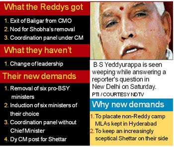 <p>The Reddy brothers, who earlier on Saturday said they would not return to Delhi for further negotiations, changed their mind by the end of the day and left for the national capital along with loyalist and Health Mi</p>.<p>nister B Sriramulu late in the night. <br />The Reddys’ departure to Delhi prompted senior BJP leader Venkaiah Naidu to declare that the governmental crisis would end on Sunday. The party will announce its “final decision,” he said. <br />Naidu was speaking to newsmen after a two-hour long meeting of top party leaders at his residence where the chief minister was present. <br /><br />Top sources in the BJP told Deccan Herald that no ministers, except Shobha Karandlaje, would be dropped, contrary to fresh demands by the Reddy brothers for sacking at least five more ministers perceived to be close to the chief minister. <br />Assembly Speaker Jagdish Shettar, projected as their leader by the rebel camp, would be inducted into the ministry. <br /><br />Shobha to resign<br /><br />The sources said Shobha, whose exit was one of the top demands by the Reddys, would resign. This would be in addition to the transfer of the chief minister’s principal secretary V P Baligar which happened on Friday. The sources claimed: “The dropping of these two was not the demand of the Reddys but of the MLAs angry with Yeddyurappa’s style of functioning. The MLAs would be happy with these two actions.”<br /><br />As for the Reddys, the chief minister has agreed to look into their demands which mainly pertain to their ‘business interests.’ “There is no question of yielding to any pressure tactics of the Reddys,” sources added.<br /><br />On Saturday afternoon, Shettar was said to have sent feelers to the chief minister that he was prepared to join the cabinet. However, he wanted one or two of his followers, too, to be inducted. The chief minister is said to have favourably reacted to the Shettar overture. <br /><br />The Reddy group, however, insisted on dropping of six ministers: Shobha, Basavaraj Bommai, Lakshman Savadi, Murugesh Nirani, C M Udasi and Hartal Halappa. <br /><br />However, with Shettar shifting sides, this may not be pressed by the dissidents on Sunday. According to the party leaders, the high command has recognised the contribution of the Reddy brothers to the growth of the party, especially in Bellary district where it had no base. Noting that the party leadership was fully behind Yeddyurappa, the sources said the core committee would be reconstituted. <br /><br />Performance review<br /><br />The central leadership, which has asked the chief minister to be flexible with his MLAs, said it would consider the demand for a review of his performance and style of functioning after six months. <br /><br />Another demand of the Reddys for inducting C T Ravi, Ramdas, Renukacharya, Bellubbi and Belur Gopalakrishna, all who have rebelled against the chief minister, into the ministry has been rejected by Yeddyurappa. <br /><br />The Reddy camp’s decision to drop its demand for a change of leadership came in the wake of its categorical and repeated rejection by the high command, saying that the party would rather go in for fresh elections than drop Yeddyurappa. <br /><br /></p>