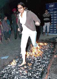 <p>A group of 30-odd corporate executives underwent a unique workshop on stress busting in Amritsar on Thursday where they were asked to undergo a range of activities aimed to make them corporate toughies. While some of them walked over burning coals, others bent steel rods with their necks or broke bricks with one fell swoop of their hand.<br /><br />All this was done to make them tough and confident to face hardships of the corporate life. The theme of the workshop was “discover the power within” and was aimed at imparting orientation in leadership, effectiveness and stress management.<br /><br />“Results cannot follow unless people take action. The aim of these activities was to give them confidence and motivate them to cross barriers and succeed,” said P S Rathore, a motivational speaker who ran the workshop organised by the Confederation of Indian Industry (CII).<br /><br />Rathore said if the participants could undergo these tough activities with their chin up, it would give them confidence to accomplish any task in life.<br /><br />Participants were enthused by the freshness of activities than mere lectures on leadership and management. <br /><br />One of them said: “The workshop has boosted by confidence. I feel better equipped to face people and situations in life now.”</p>
