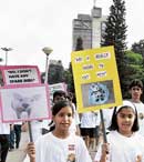 <p> Over 400 people walked the three-and-a-half kilometre stretch to promote November 25 as meatless, which also coincides with the birth anniversary of the Mission's founder Sadhu T L Vaswani. The event was part of a similar mission carried out in ten other cities across the country.<br /><br />Apart from this, the organisation also approached 205 schools in the City. "We created awareness to stop killing of all animals and also distributed pledge forms to be given to their family and relatives. We have received four and a half lakh pledges till date," said Rahul, one of the Mission members. <br /><br />To reach out to more people, they have also planned to set up kiosks on November 24 at Commercial Street, Brigade Road, Garuda Mall, Forum Mall and Sigma Mall. The volunteers will request people to take pledge to be vegetarian at least on November 25.</p>
