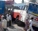 <p>The KSRTC bus, headed towards Mysore was standing at the entrance of the bus terminal, when a container truck hit the bus, which in turn hit a car. The car in turn rammed into an autorickshaw. <br /><br />All the vehicles sustained major damage. The truck driver Pandian sustained injuries and has been admitted to Victoria hospital. <br />The accident resulted in a major traffic jam on Mysore road. A case has been registered by the Byatarayanapura police.<br />In a another accident, Ashok Kumar (25) of Madanayakanahalli was injured after he was hit by a truck on Tumkur Road near Parle factory on Friday morning. Ashok was on his way to work. <br /><br />He is being treated at a private hospital in Dasarahalli. Even though passersby caught hold of the driver of the truck and beat him up, he still managed to escape. <br />Peenya traffic police have registered a case.<br /><br />Chain snatching<br />A bike borne chain snatcher made away with a chain worth Rs 13,000 on Thursday evening. Deepika of Saraswathinagar in Vijayanagar area was returning to her house after paying her phone bill. She was walking on 7th cross, when a person on a bike came from behind and snatched her chain. Vijayanagar police have registered a case.</p>