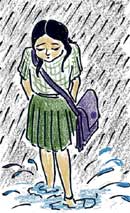 <p>Then, the four blue walls of the room began to close in on her, and she was trapped in the gloomy confines of the room once more. Her heart sank. Her marks. They were unsatisfactory. <br /><br />They weren’t bad – they could have been much worse, but they weren’t very good either. They were just average. <br /><br />Dreadfully average.<br /><br />The bell rang, and the prayer began and ended. A sea of schoolchildren poured out the classroom and her friends swarmed around her like flies.<br /><br />She looked away from them limply, and they understood that she wanted to be alone.<br />She watched the clouds sending down the raindrops steadily and in quick succession like bullets. <br /><br />The school ground wasn’t empty. Colourful umbrellas and raincoats shielded the children from the battering rain as they ran helter-skelter across the slush.<br /><br />Parents looking for their offspring scuttled around like worried hens, unmindful of their dripping wet clothes.<br /><br />The leaves flapped furiously in the wind, trying desperately to shake off the heavy, wet raindrops that beat down upon them steadily.<br /><br />Only the teachers marched on mechanically, their staid black umbrellas sheltering them from the raindrops that went pitter-patter as they made contact with the hard nylon.<br /><br />On the road, vans, autos, scooters, cars and buses honked, sputtered, screeched and whirred. <br /><br />Cars brandished their sword-like wipers which went swish-swish across the rain- streaked windows.<br /><br />Pedestrians who had been caught unawares by the unsurprisingly unpredictable Indian monsoon stood under shop roofs and bus-stands, envying those who had had enough foresights to carry umbrellas. <br /><br />Vendors of jasmine and marigold in thin, flowery saris sat under blue synthetic tarpaulins, surveying the world around them with an almost cynical air. <br /><br />Evening joggers sought shelter in tea stalls that seemed to mushroom every evening, swapping stories and sipping chai.<br /><br />Only she trudged through the slush slowly and dolefully, wallowing in self-pity; oblivious to the ever-changing, ever-moving world around her. <br /><br />A bright red car, probably an I10 whizzed past her, peppering her with fat wet raindrops. <br />She shook off the water, and looked at the world around her with renewed interest. The rain cast a spell on the whole world. The whole world was bustling with activity, refusing to remain dormant for even a second. People moved along with the monsoon, and by doing so, they were able to forget themselves, i.e. when it was raining there was no time to think of anything else.<br /><br />All she would have to do was to follow the rhythm of the rain, and everything would be alright. <br /><br />So she found herself listening to the rhythmic pitter-patter of the falling rain, and it was telling her that there was no time to think of anything else.<br /><br />There was no time to think if she wanted to catch up with the swiftly moving world. There was no time to feel average.<br /><br />No time to feel dreadfully average.<br /><br />A smile brightened her face, and she ran to catch up with her friends. <br /></p>