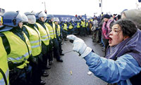 <p>The police tried to disperse the chanting, drum-beating protesters who had marched from a train station about a mile away to try to make their way to the Bella Center, where representatives from nearly 200 countries are meeting to try to reach an accord on climate change. <br /><br />A group of 50 to 100 delegates emerged from the convention centre, seeking to meet with the protestors, but they, too, were driven back by the police. In Wednesday’s demonstrations, the largest so far of the conference, the protesters began massing north of the centre shortly before noon and pressed into a tight line of riot police blocking access to the hall. <br /><br />Some of the officers wielded truncheons against the chanting, shoving protesters in a close-order scrum. News agencies reported that tear gas was fired at the crowd. After forcibly removing protestors from a truck parked in an intersection outside the Bella Center, police kept moving the protesters backwards, nearly pushing some into a watery marsh.<br /><br />Human chains<br /><br />As the police vans advanced, skirmishes broke out with protestors who formed human chains and chanted their commitment to nonviolence and to helping people in parts of the world that they said would be hardest hit by climate change.<br /><br />A number of protestors encouraged individual groups to keep pushing against the police.<br /><br />The Police deployed water cannon at the southeast corner of the center to push back the marchers if necessary. “I can only say,” said Per Larsen, chief coordinator for the Danish police, “that they will not be able to enter the Bella Center.”<br /><br />Climate Justice Action, a Danish umbrella group that has served as the organising agent for a number of planned and spontaneous demonstrations during the conference, has a permit to march along a specified route south of the venue.<br />According to one organiser, Anne Petermann, the overarching message of Wednesday’s action is that the United Nations process for curbing climate change is a failure, and that there are “thousands of other solutions to climate change that aren’t being considered,” she said.<br /><br />‘Rights violation’<br /><br />Another member of the protest group, Richard Bernard, said he expected arrests and possible clashes with police. “Danish police have been violating human rights all week,” he said.<br /><br />Authorities were restricting access to the rail station serving the Bella Center, forcing many conference attendees to walk a mile or more in cold drizzle and biting winds.<br /><br />Groups of delegates and members of nongovernmental organisations continued to stream on foot pass subway stations that had been closed to prevent demonstrators from converging.<br /><br />They passed groups of detained protesters seated in neat rows, their hands tied with plastic police strips. Behind a department store, about a dozen detained protesters under police guard chanted anti-capitalist slogans.<br /><br /></p>