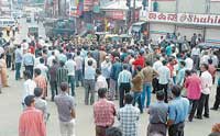 <p>CMC had locked newly opened Cauvery Garments for not taking license and another Crown Furniture for not renewing the license. Merchants shut down their business establishments and staged protest at Indira Gandhi Circle. They shouted slogans against CMC and blocked the road, thus causing inconvenience to the vehicle users. <br /><br />They said “CMC has been harassing the businessmen in the name of renewing license. Several shop owners have submitted their applications for the renewal of license two to three months ago. However, CMC has not renewed license so far. Health inspectors demand bribe. Though we have submitted complaints against the officials, no action has been initiated so far,” protestors alleged. <br /><br />The protesters urged CMC Commissioner and Food Inspector to visit the spot but neither the CMC President nor officials came to listen to the grievances of the merchants. Later, the protesting traders visited Deputy Commissioner. DC K H Ashwathanarayana Gowda called CMC Commissioner and President. CMC President P D Ponnappa, Standing Committee President Prakash, Commissioner K Srikanthrao came down heavily on the traders for not contacting them over the problem. This led to verbal dual between the merchants and officials. Later, DC convened a meeting where, the officials informed that the traders had failed to take license. <br /><br /></p>