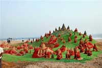<p>Santas, spreading messages about "global warming", are coloured red while Christmas trees are green.<br /><br />Two little girls from West Bengal inaugurated the exhibition here at the beach on eve of Christmas last evening.<br />"The girls were chosen to inaugurate the event because children love Santas," Pattnaik said.<br /><br />Pattnaik said, "It took nearly 48 hours to create 105 Santas and Christmas trees. About 1,000 tons of sand was used in creating the statues," he told PTI.<br />Puri is the place where sand art started in the 14th century. "Besides, the tourist flow into Puri is another reason why I chose to build awareness about global warming through Santas here this time," he said.</p>