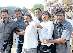 <p>The prime minister was addressing a congregation of Congress leaders and activists on the occasion of the 125th Foundation Day of the party. <br /><br />“Our party’s policies are aimed at uniting the society and the country and not dividing them. Our party is ready to accommodate every shade of opinion within the Constitution,” he said, without directly referring to Telangana.<br /><br />However, after meeting the Congress top brass on Monday, the pro-Telangana ministers ruled out withdrawal of their resignation and insisted on a “categorical time-frame” for creating the new State. <br /><br />“We want a categorical time-frame for the formation of the separate State (of Telangana),” Andhra Pradesh Higher Education Minister Sridhar Babu told journalists here.<br /><br />Finance Minister Pranab Mukherjee had on Sunday asked the pro-Telangana ministers to withdraw their resignations.<br /><br />Meanwhile, as part of intensifying the struggle for Telangana, the all-party Telangana Joint Action Committee (JAC) has called for a bundh for Wednesday. <br /><br />The JAC has called for protest rallies on Monday and Tuesday to be followed by a bundh on Wednesday. <br /><br />The protests had taken a break of six days partly in deference to Christmas and Muharrum. Even as protests continued on Monday, the police arrested six students, who have been on an indefinite fast at the Osmania University campus for the past five days, as their condition deteriorated. Tension prevailed as hundreds of students resisted their removal. <br /><br />A large number of policemen, including personnel from the Central Reserve Police Force, were deployed on the campus. In an attempt to prevent the mobilisation of students, the university authorities have closed down hostels and messes till January 5.<br />Hours after the fasting students were removed, more students went on an indefinite hunger strike. <br /><br />Meanwhile, the students announced that they would hold a massive convention called ‘Vidyarthi Garjana’ on January 3 in Hyderabad to press the Centre to announce the formation of Telangana. However, Hyderabad police Commissioner B Prasada Rao said the police would not give permission for such a programme.<br /><br />The JAC, which has supported the ‘Garjana’, also threatened to lay siege to the city if the Centre failed to initiate the process for the formation of Telangana by January 2.<br /><br />The month-long agitation has cost huge losses to the public exchequer as also to the private sector. According to official estimates, property worth Rs 250 crore has been destroyed in all the three regions of the state with 80 per cent of the losses being incurred in the Telangana region. <br /><br />A new target this time were mobile phone towers several of which were burnt down or brought down. </p>