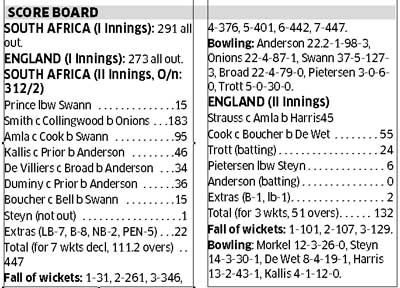 <p><br />Jonathan Trott wan unbeaten on 24 with nightwatchman James Anderson giving him company after South Africa, 1-0 down in the four-match series, declared their second innings on 447 for seven. <br /><br />Going along nicely with a century opening stand, England suffered a sudden collapse when Alastair Cook (55) edged Friedel de Wet to wicketpeer Mark Boucher while captain Andrew Strauss was caught by Hashim Amla of Paul Harris as the visitors fell to 107 for three. Kevin Pietersen was trapped leg before by fast bowler Dale Steyn for six, leaving the visitors an improbable task of saving the Test on the final day on Thursday.<br />South Africa batted for 40 minutes after lunch, scoring 50 runs and leaving England a minimum of 146 overs in which to survive.<br /></p>